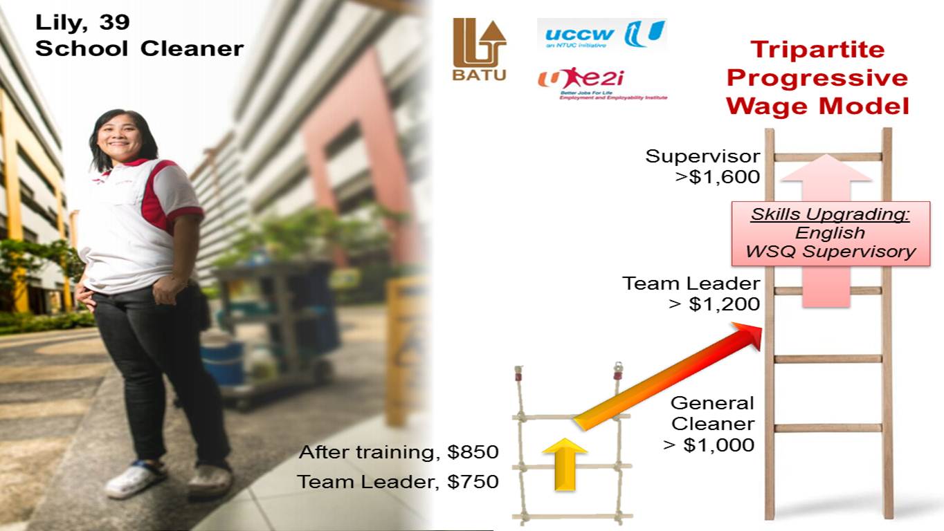 Lily is a school cleaner whose pay, before PWM, had been marginally increasing by an average of $50 a year. After PWM was implemented, her salary jumped significantly from $850 to $1,200 and she can also increase her salary to $1,600 and beyond with skills upgrading.