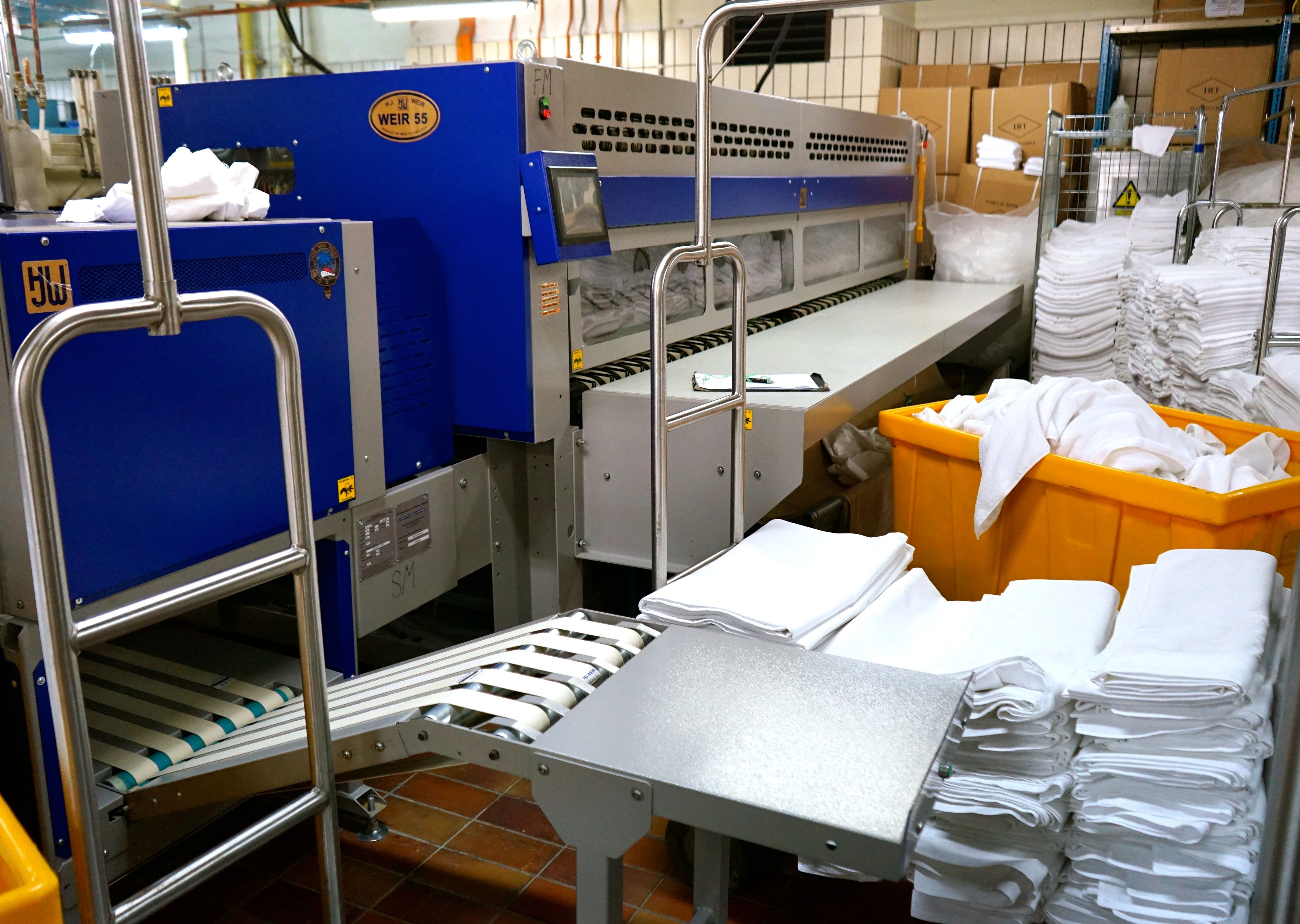 the bedsheets and pillow cases will all go to this amazing machine which folds them neatly into convenient take and go bundles.