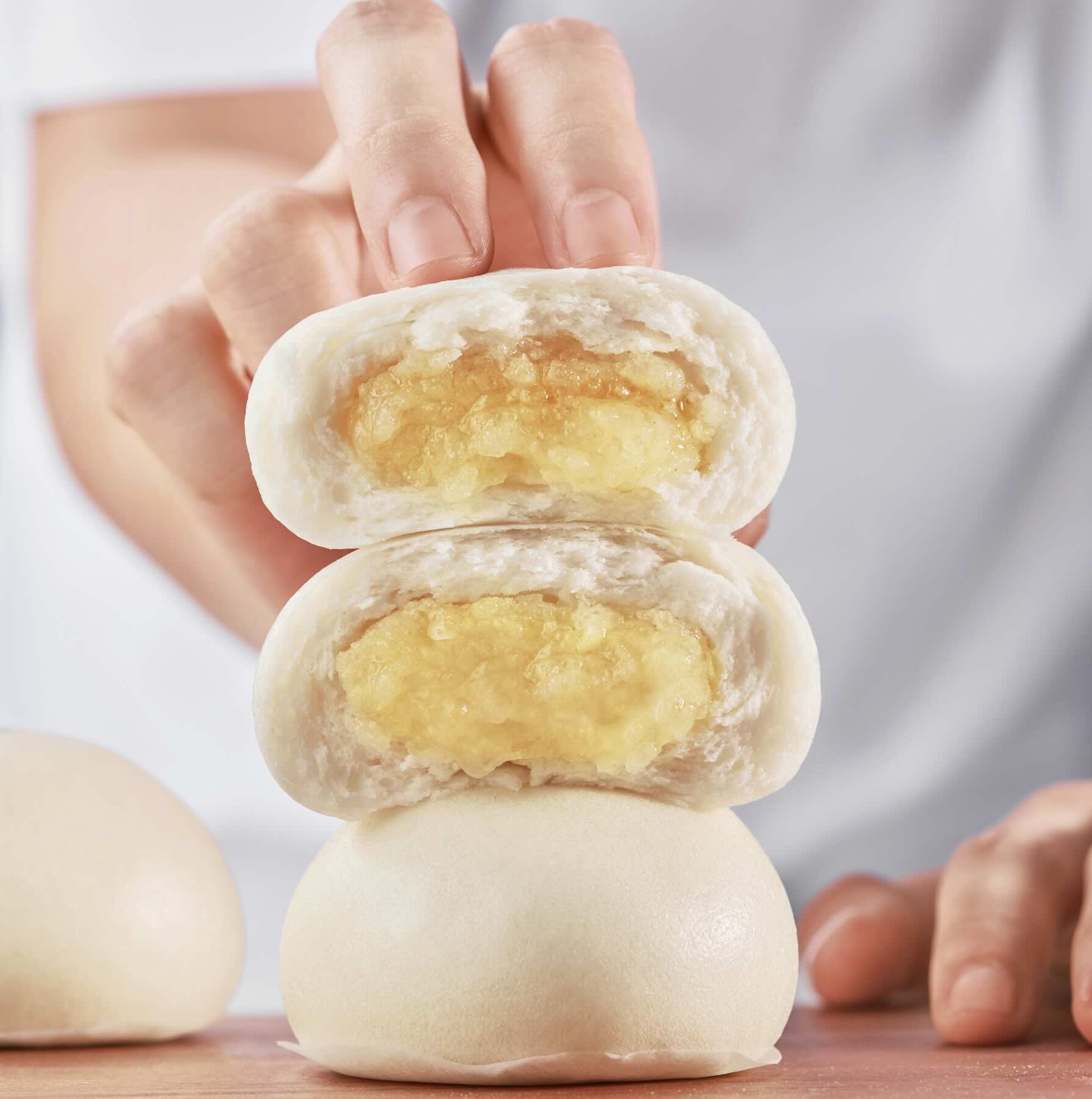 For a more traditional option, step back in time with the Steamed Butter Buns 牛油包, reminiscent of the classic flavours of traditional toast with sugar and butter. These buns feature a soft and lustrous golden-hued filling that is simply irresistible and perfect for all ages. Experience the decadent aroma of butter, complemented by the granular texture of crushed rock sugar, enhancing each bite with a delightful combination of sensory richness and sweetness.