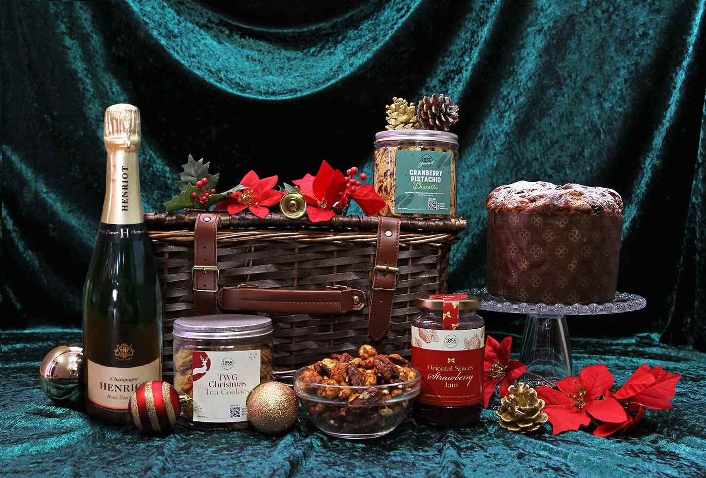whilst the Gourmet Cadeau Festive Basket (S$208 Net) holds the emblematic Henriot Champagne Brut Souverain NV, classic Italian panettone, homemade oriental spice organic strawberry jam, as well as baked treats from the gift box.