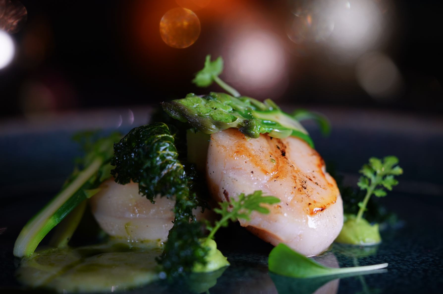 His love for Southeast Asian ingredients is showcased through a visually eclectic way with appetizers such as Lime Coconut Cured Kingfish with kaffir lime emulsion; Seared Jeju Abalone with fermented cabbage barley; and Spiced Duck Breast on turmeric corn and curried carrot.