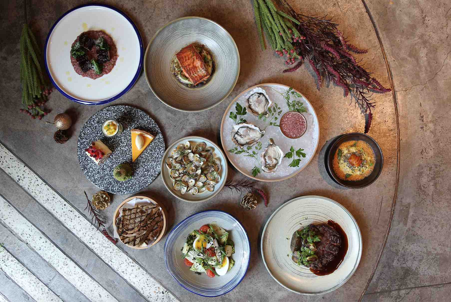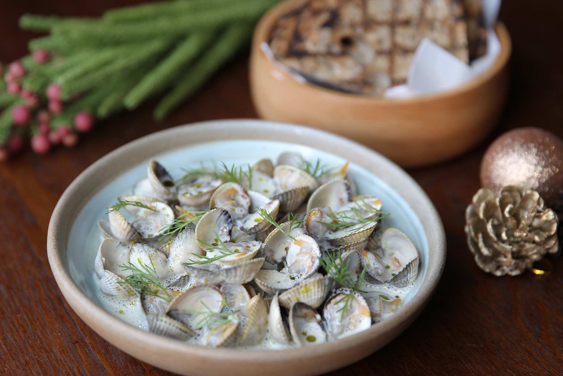 For brunch lovers, the festive sharing menu starts with small plates of freshly shucked pacific oysters; niçoise salad; sauteed French cockles with sourdough bread; Foie Gras de Canard with black vinegar gel; and Scrambled Eggs & Sea Urchin in lobster bisque.