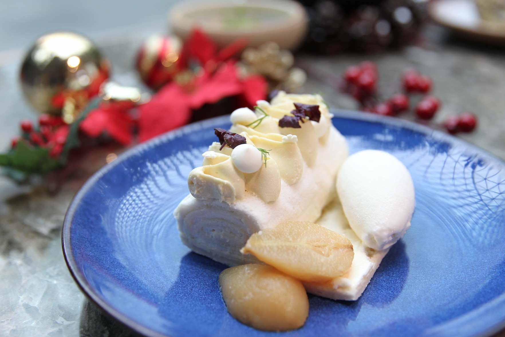 Sweet-toothed diners will enjoy “Snow White” Log Cake that is filled with a tropical soursop filling, and served with rum poached baby pear and lavender gelato.