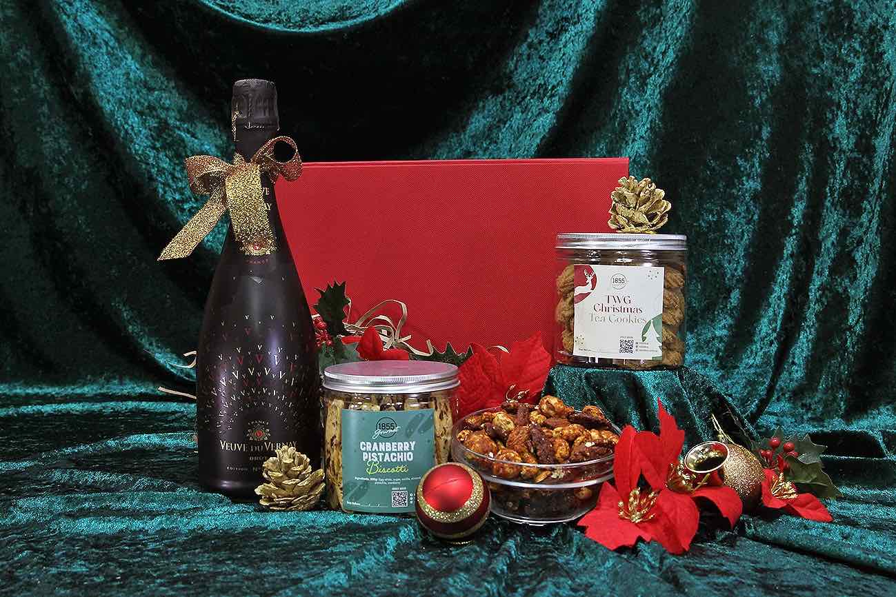 For something more extravagant, 1855 Gourmet offers festive gift baskets filled with homemade gourmet treats and choice bubbles from 1855 The Bottle Shop. The Sparkle and Spice Gift Box (S$98 Net) includes a limited edition Veuve Du Vernay Sparkling Brut No.2, TWG Christmas tea cookies, cranberry pistachio biscotti and house-baked spiced mix nuts;