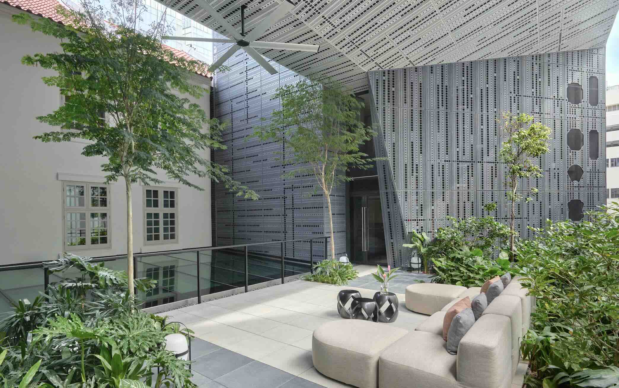 Sustainability is a big part of 21 Carpenter, from preserving the building’s historic materials to eco-friendly features. The original 1930s Chengal wood has been carefully reused in lobby floors, Heritage suites and the sculptural handrail along the hotel’s five-foot way. The rooftop gleams with 22 photovoltaic panels to supplement power needs, while a hybrid cooling system, combining ceiling fans with air conditioning, lowers electricity consumption. The aluminium art facade of the Urban extension also functions as a sunscreen, further reducing the need for active cooling. The hotel aims to reduce single-use plastic waste by employing reusable water carafes and amenity dispensers.