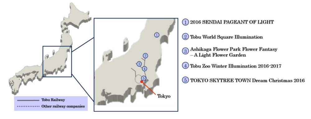 There is never a better time to visit Japan and explore a special illuminating theme by rail this winter! Tobu Railway Co. Ltd, the biggest private railroad company in Kanto, Japan, offers routes to five special winter illumination events to spend the year-end holidays. Limited to the winter season, the displays start in late October and run until March 2017.