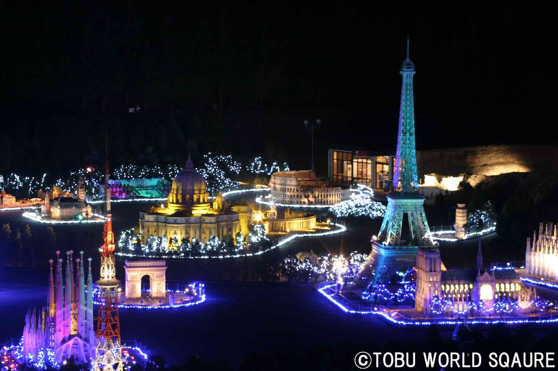 At Tobu World Square, 102 world-famous buildings from 21 countries are skillfully reproduced on a 1/25 scale, including 46 buildings registered as UNESCO World Heritage Sites. Every building will be illuminated this winter! Landmarks such as the world’s tallest tower TOKYO SKYTREE, the supertall skyscraper “TAIPEI 101” in Taiwan were added to the collection last year. The Eiffel Tower, Duomo in Milan and the pyramids of Egypt among many others will be lighted up simultaneously, creating a dream-like, fantastical setting.