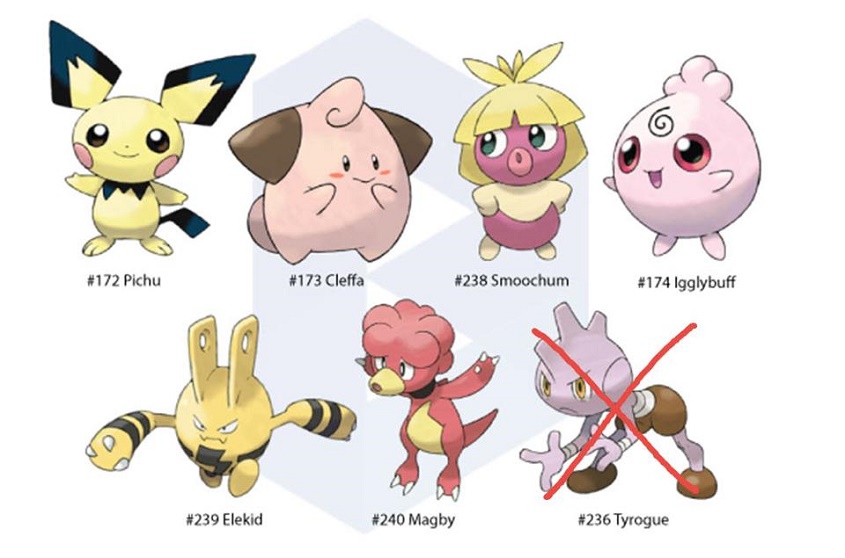 The last new Pokémon missing from this list is Tyrogue, which evolves into Gen 1’s Hitmonlee and Hitmonchan, and also Gen 2’s Hitmontop.