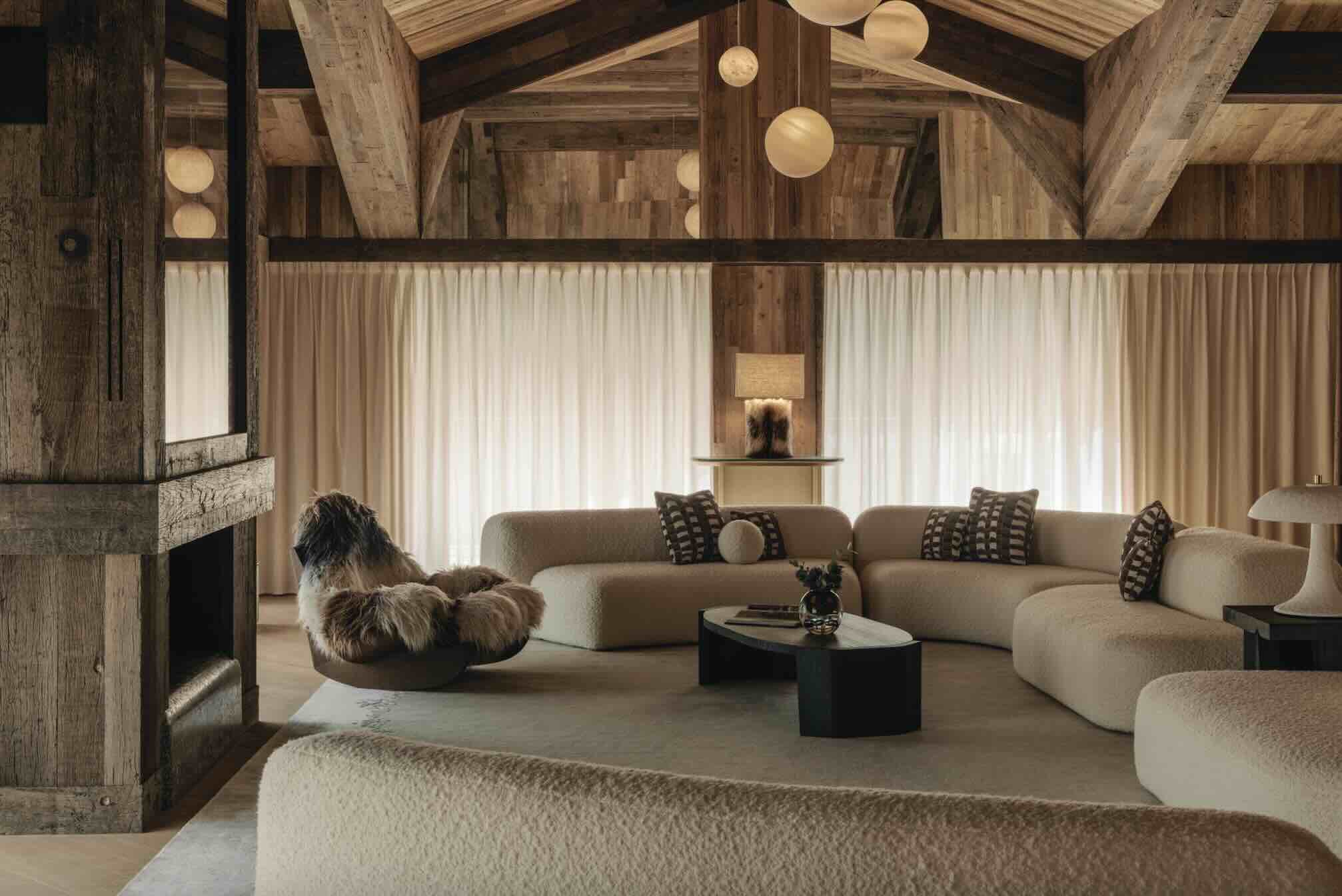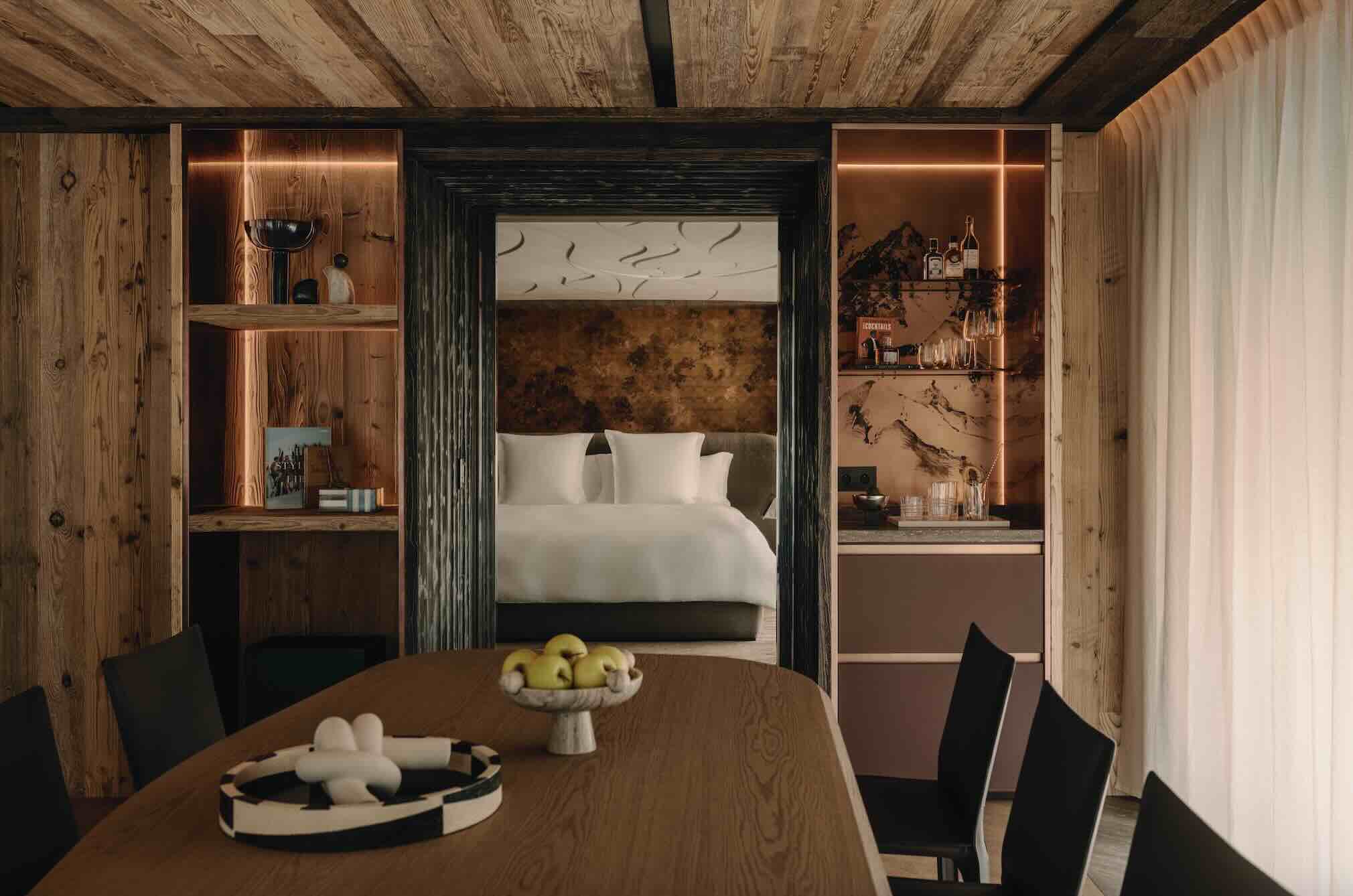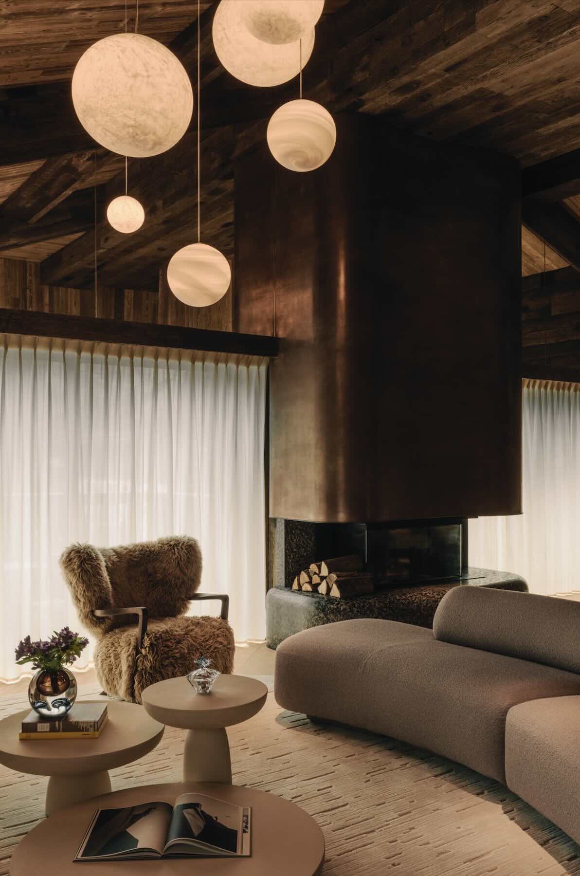 Each guest is welcomed through carved sculptural doors into a world that feels equal parts private chalet and modern sanctuary. Think fireplaces that glow across snow-laced terraces, textured fabrics that mirror the landscape’s natural palette, and artworks that invite reflection, not just admiration.