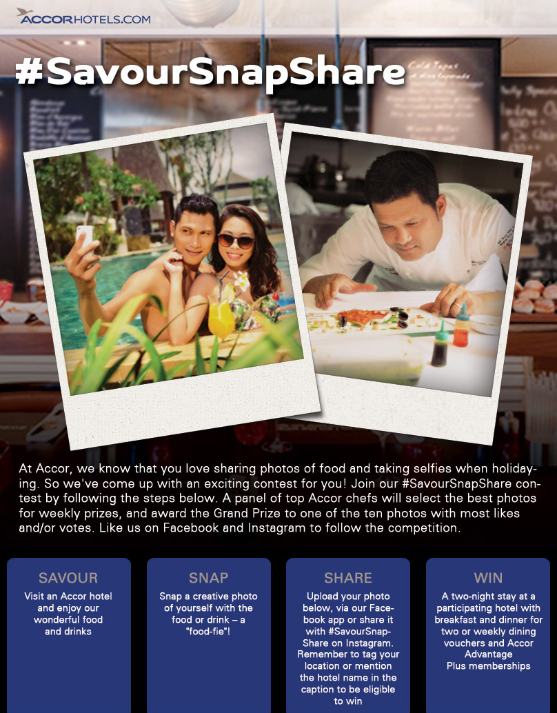 The contest will run from 10 February 2015 to 9 March 2015 and is open to those above 21 years of age and legal residents in Singapore, China, India, Indonesia, Korea, Thailand and Vietnam. Spanning various social media platforms, namely, Facebook, Instagram and Weibo, participants stand the chance to win weekly prizes including dining vouchers and Accor Advantage Plus memberships, as well as the grand prize of a two-night stay at a participating Accor hotel of their choice.