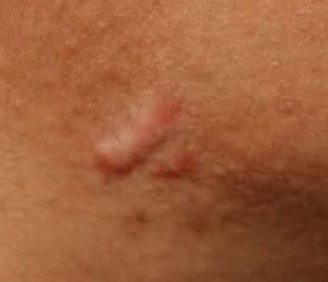 These are bumpy scars raised above the skin surface. They are caused by an overproduction of collagen or a build-up of scar tissue from outbreaks of acne. These are more common on the jawline, shoulder, chest and back.