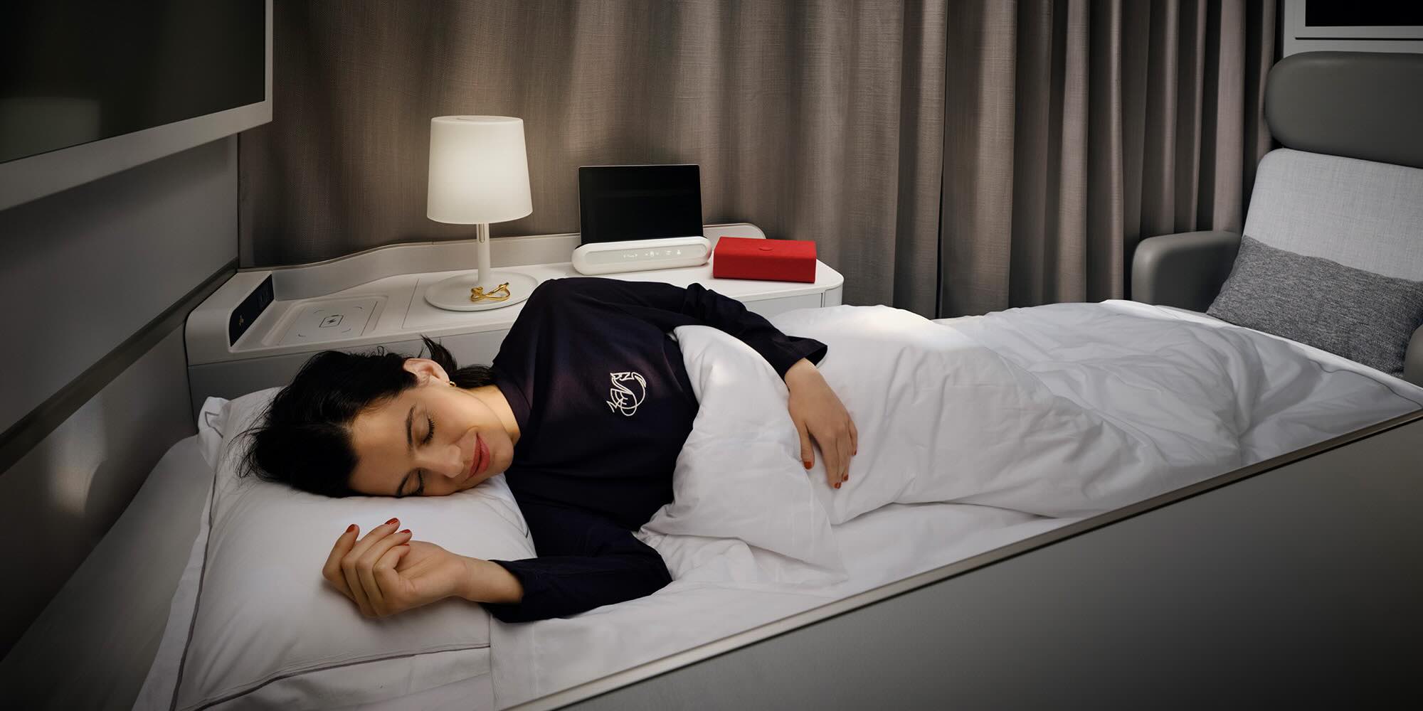 The new La Première suite brings technological sophistication to the luxury experience. You can enjoy two 32-inch 4K screens, intuitive wireless touchscreen controls, noise-canceling Denon headphones, and free ultra-high-speed Wi-Fi. USB-A, USB-C, 110V/220V outlets, wireless charging stations, and smartphone holders ensure effortless connectivity throughout the flight. You can adjust lighting, window shades, and seat positioning at a simple touch — creating a perfectly personalised environment.