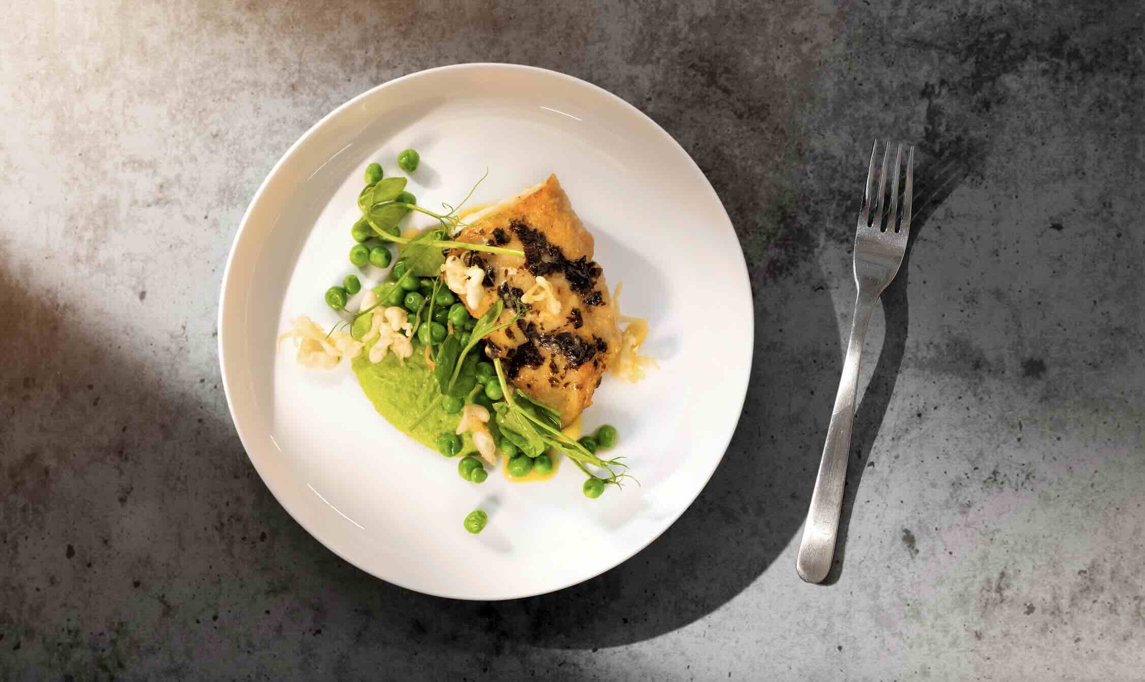 - Seared Hauraki Gulf snapper with nori butter, green pea purée, and crispy batter bits