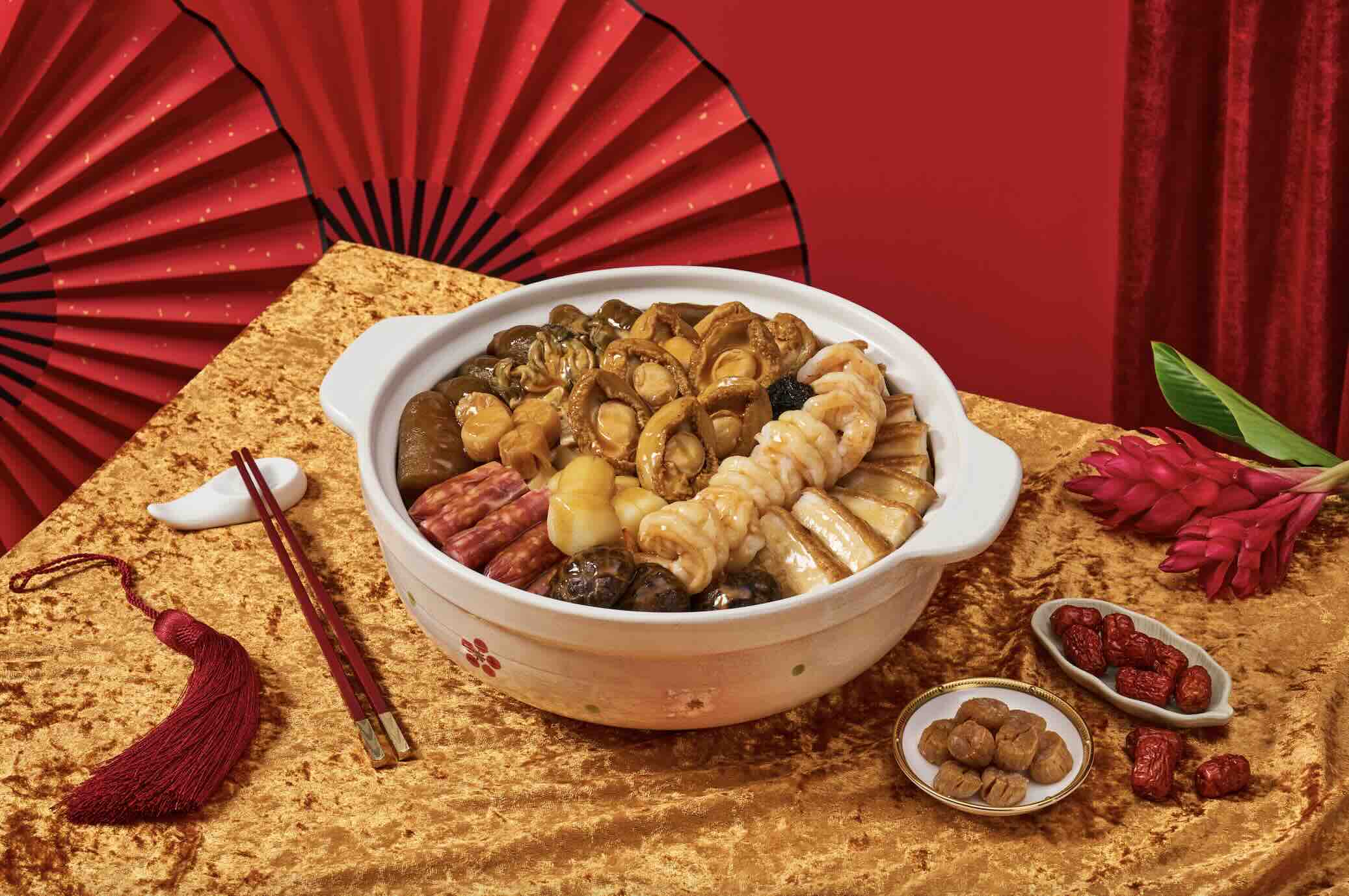 Coupled with a selection of premium earthy Shiitake Mushroom, fresh Scallop, Conpoy, Chinese Sausage, Black Moss, Dried Oyster, White Cabbage, and Yam to complete the rich assortment, the medley of goodness is simmered for three hours in a flavourful chicken broth, allowing the ingredients to meld into a delicious, nourishing harmony that is sure to impress.