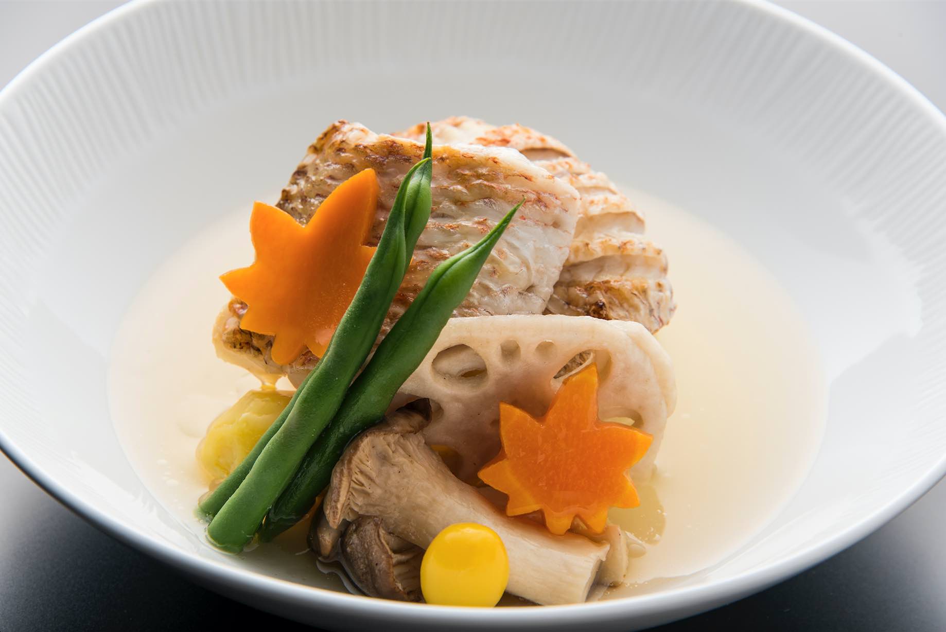 Served on International First Class flights, savour the light and tender texture of fried tilefish caught in Shimane Prefecture, paired with sautéed abalone and flavored with garland chrysanthemum puree and olive oil. In September, the “DINING h” restaurant inside the ANA SUITE LOUNGE at Haneda Airport will feature rockfish harvested from the waters of Shimane prefecture, prepared in a sauce of seaweed salt from the Hamada region. The rich fatty meat of the rockfish is fried to a mouth-watering finish in mellow salty sauce marketed under the Hamamori brand.