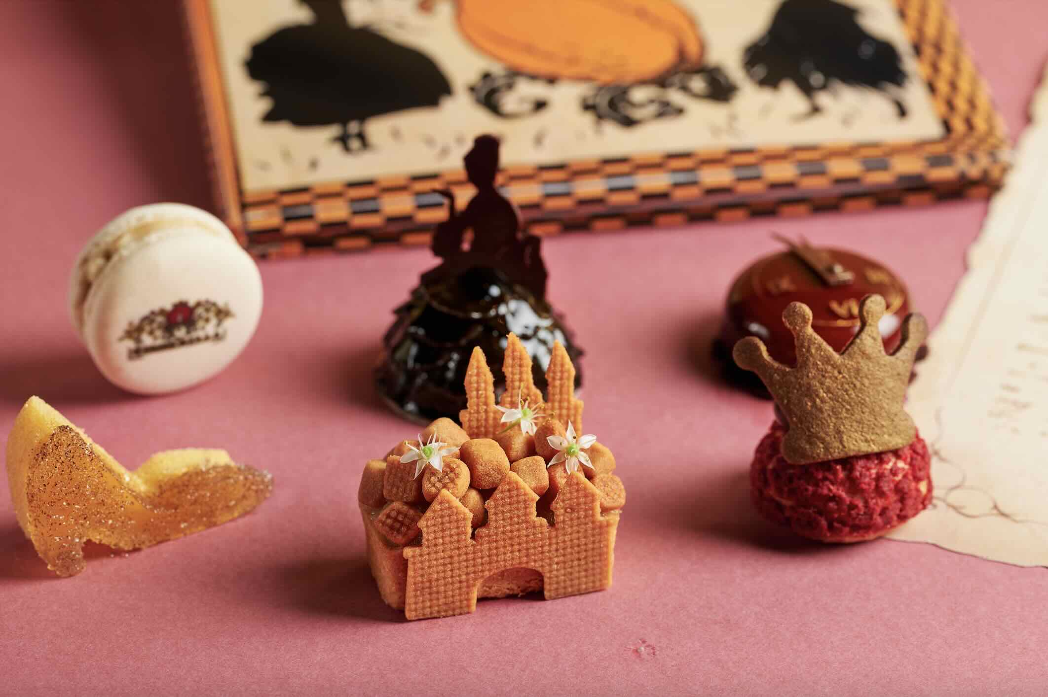 The array of sweet treats is balanced with delightful flavours. Begin with the Apple Sablé Tart, in the shape of the Prince’s Castle, and the Pumpkin Cinnamon Tea Cake, artfully designed to resemble Cinderella’s pumpkin carriage. The Apricot Confit, reminiscent of a clock striking midnight, is accompanied by caramel crémeux atop a sea salt biscuit. The Passionfruit Macaron, adorned with tropical fruit flavours and stamped with the book’s logo, is a splendid sight.