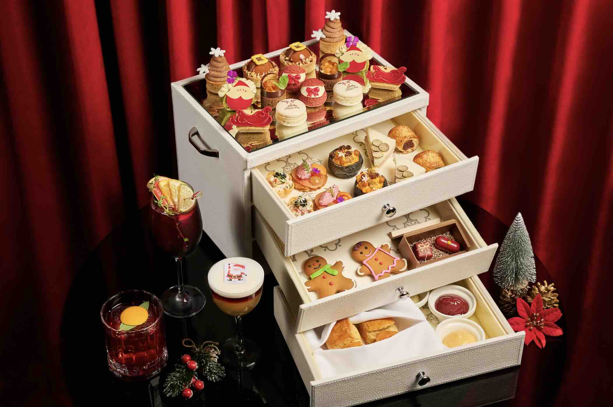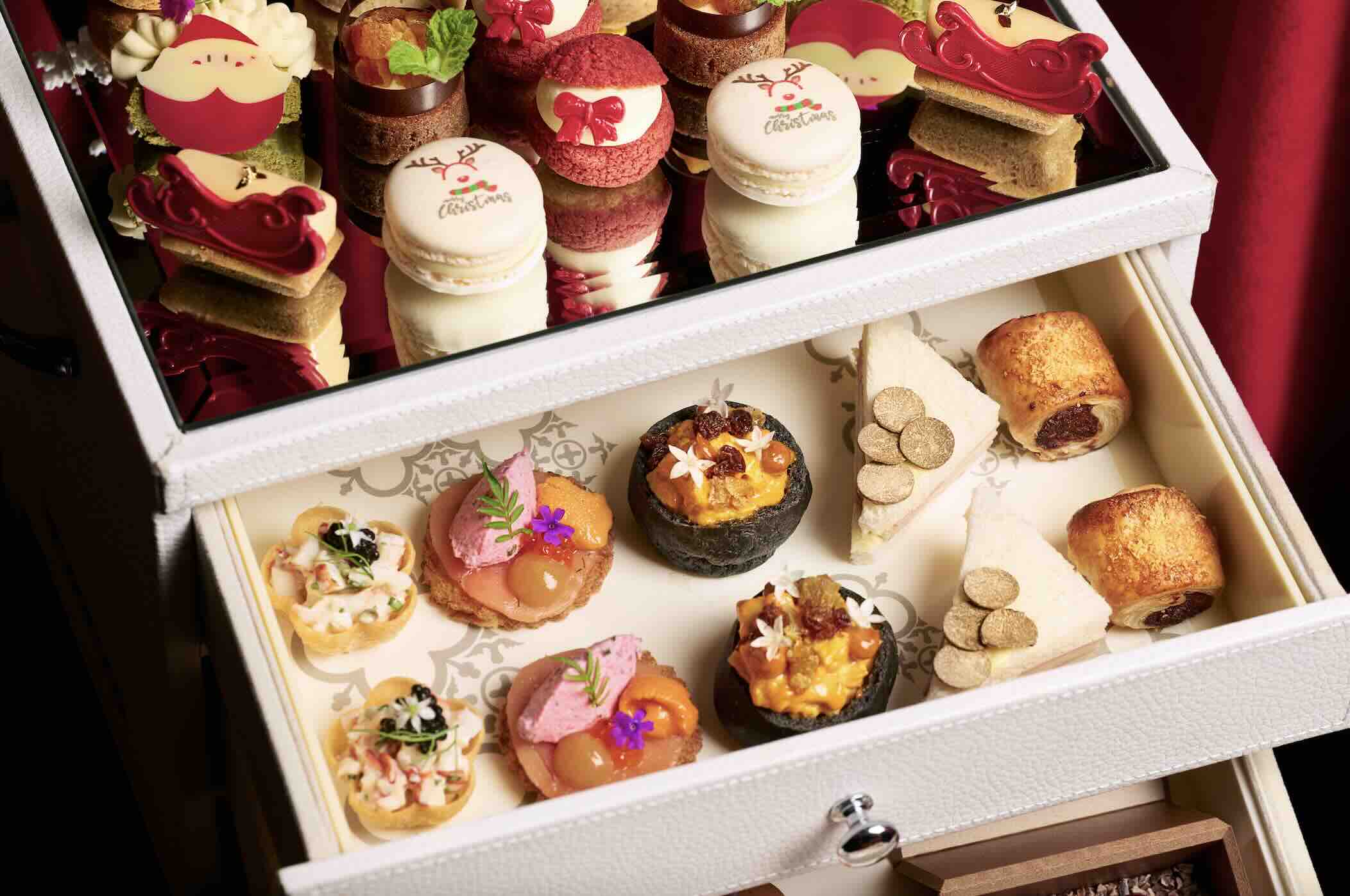 On the food front, gourmands will appreciate the Boston Lobster in a sesame basket, as well as the popular Coronation Chicken, served with a charcoal bun and a unique raisin mayonnaise. Popular Christmas ingredients such as chestnuts, brandy, and pistachio feature in the desserts. Chestnuts and housemade tangerine marmalade are served on a buttery sable, while petite festive desserts include a log cake filled with Gingerbread Crémeux and a Brandy-soaked fruit cake.
