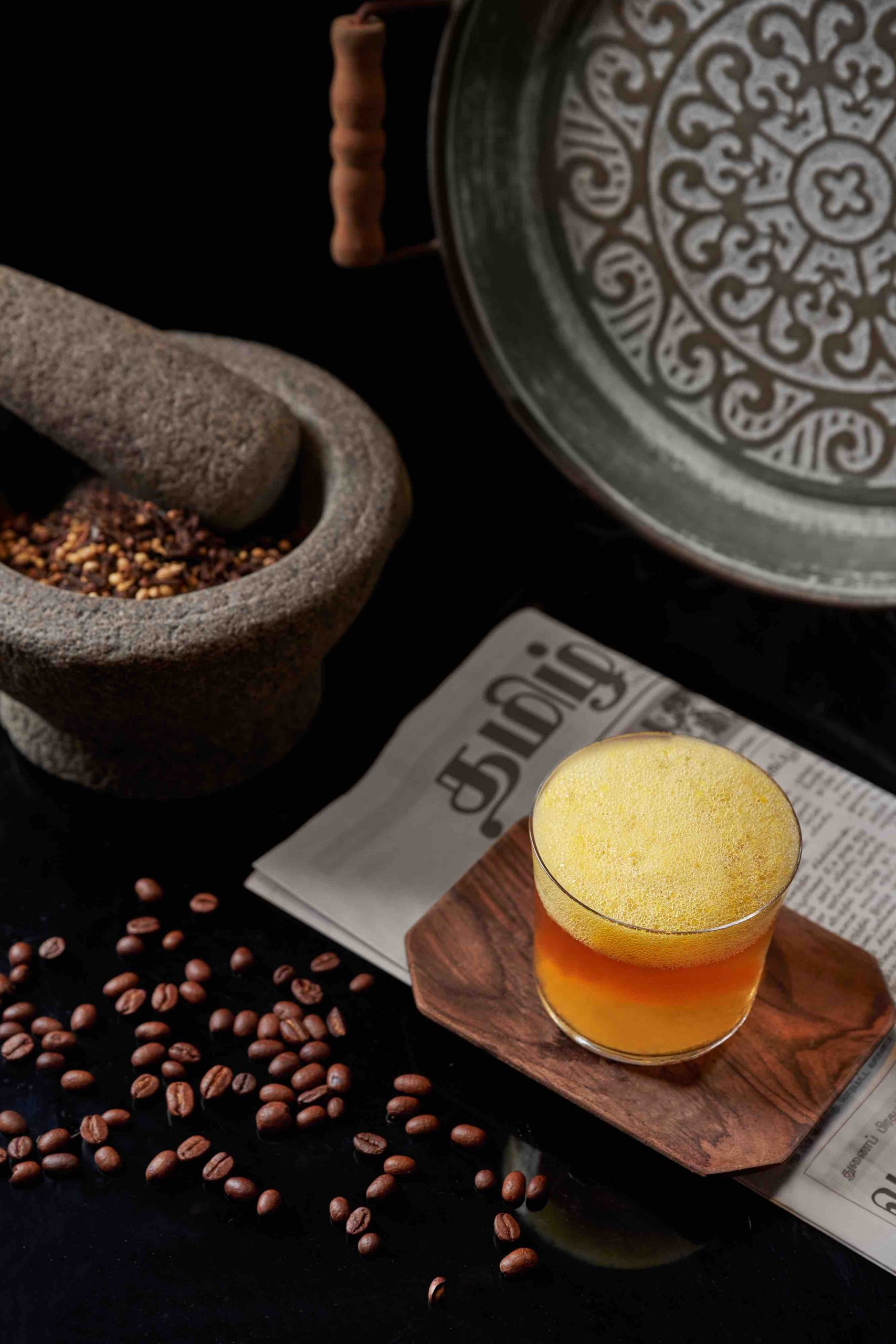 Grandma Says draws upon home remedies passed down through generations. Ammachi’s Coffee (S$25) is a cocktail inspired by the eponymous ancient Indian holistic healing practice. Adding Chukku kappi, a medicinal spiced coffee made with ginger, black pepper, cumin, and cardamom, heightens the warmth in this whisky and rum-based cocktail. Kingston finishes the drink with orange ginger air, which provides a light, invigorating contrast to the rich flavours of the cocktail. For those who prefer a non-alcoholic version (S$22), Lyre’s Malt and Spiced Cane provide a similar depth of flavour without the alcohol.