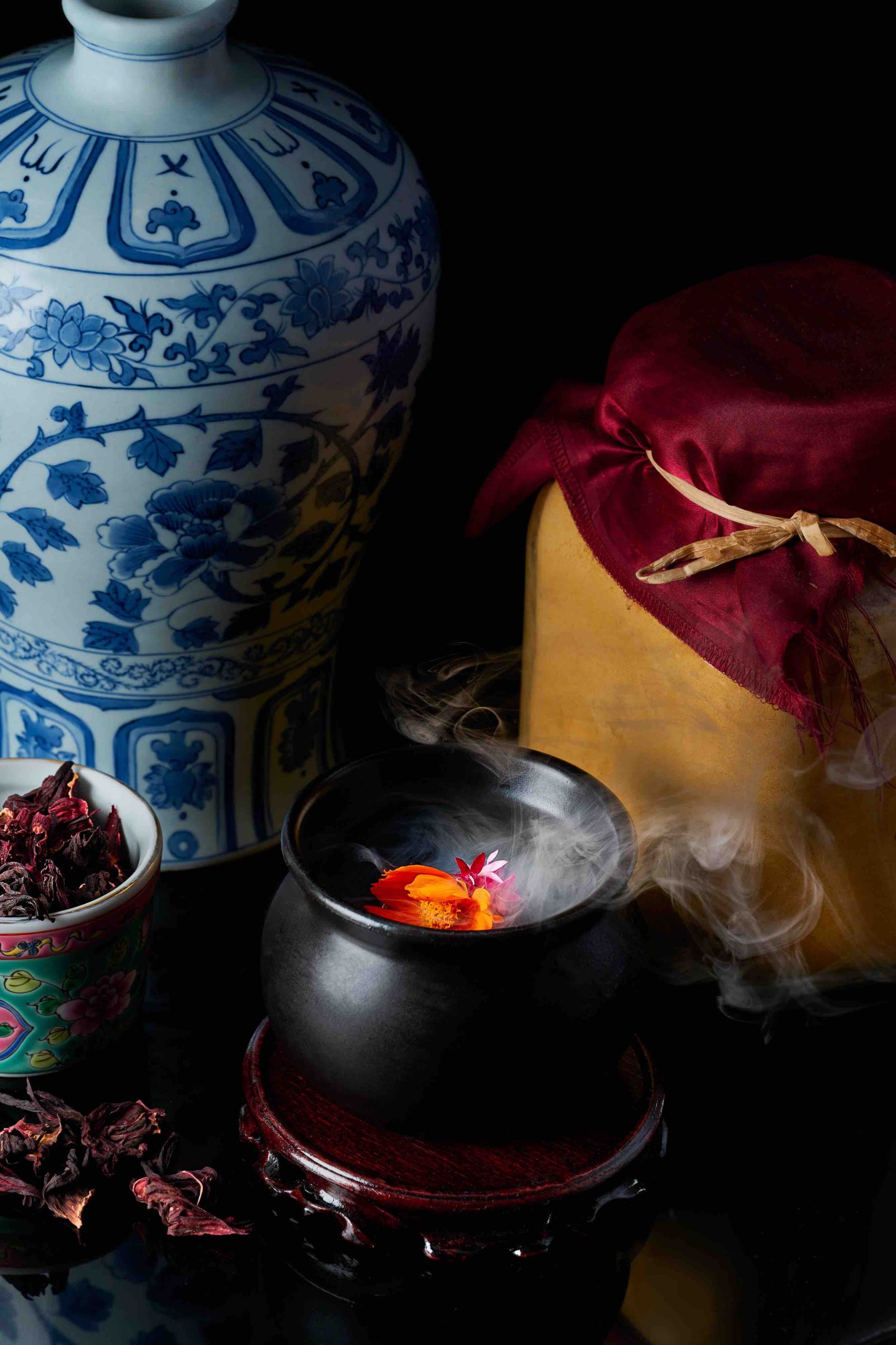 Beginning with Long Long Time Ago, Ancient Love Potion (S$25) transports guests to dynastic China with an array of historical ingredients: date-infused baijiu representing energy and fertility, rosella kombucha for digestion and pink aromatised wine. The potion is served in a smoke-filled Chinese clay pot, symbolising an offering to ancestors for healthy relationships.