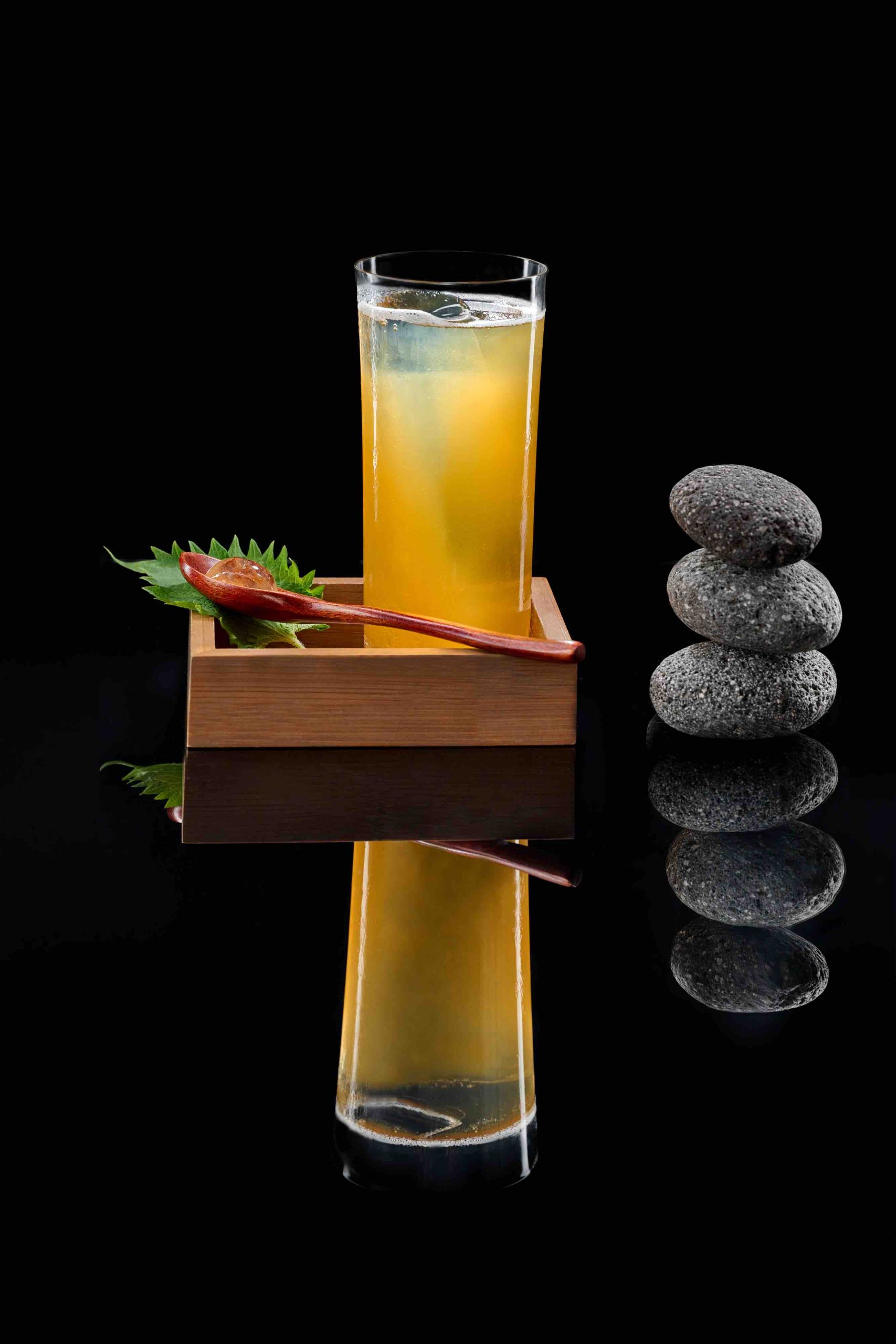 A carefully crafted Japanese brew, Obachan’s Secret (S$25) is made with umeshu, sherry and gin with sparkling genmaicha for refreshing flavours on the palate. Completing the drink is the unique homemade umami umeboshi, a superfood in Japan that is said to boost the immune system. The pickled plum is known for its salty and sour flavour, adding a savoury depth to round off the cocktail’s complex profile. Enhancing the Japanese aesthetic, the drink is served on a wooden tray next to a mini bonsai, adding an element of nature and tranquillity to the presentation, complementing the refreshing and harmonious flavours of the cocktail.
