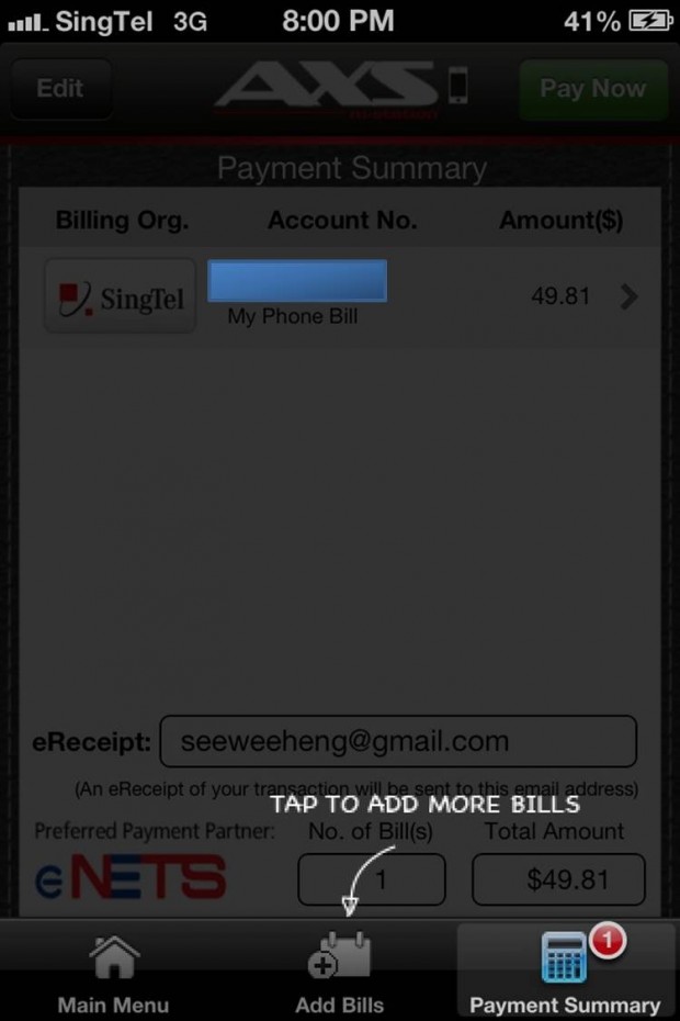 Once I click ‘Confirmed’, the app prompted me the option of adding on more bills. Well, let’s not be too adventurous on the first attempt. So I exited the Payment Summary screen with a click on ‘Pay Now’!