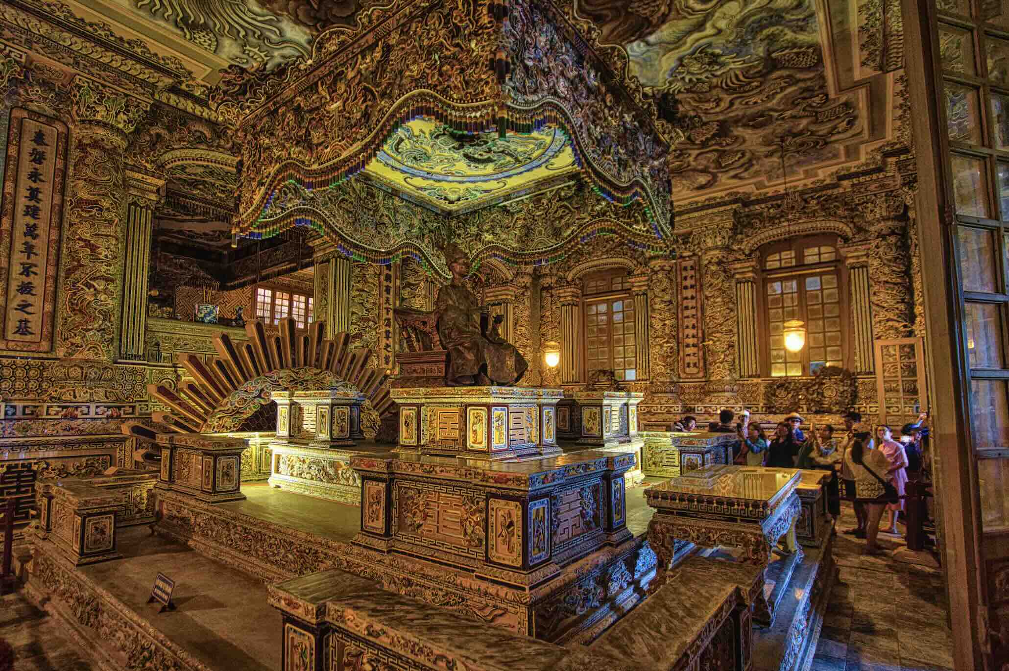 From there, the pilgrimage continues to the striking Khai Dinh Mausoleum — a fusion of Eastern design and French baroque sensibilities. Guests are invited to light an incense stick at the imperial altar, paying tribute to the past and offering prayers for happiness, harmony, and good fortune.
