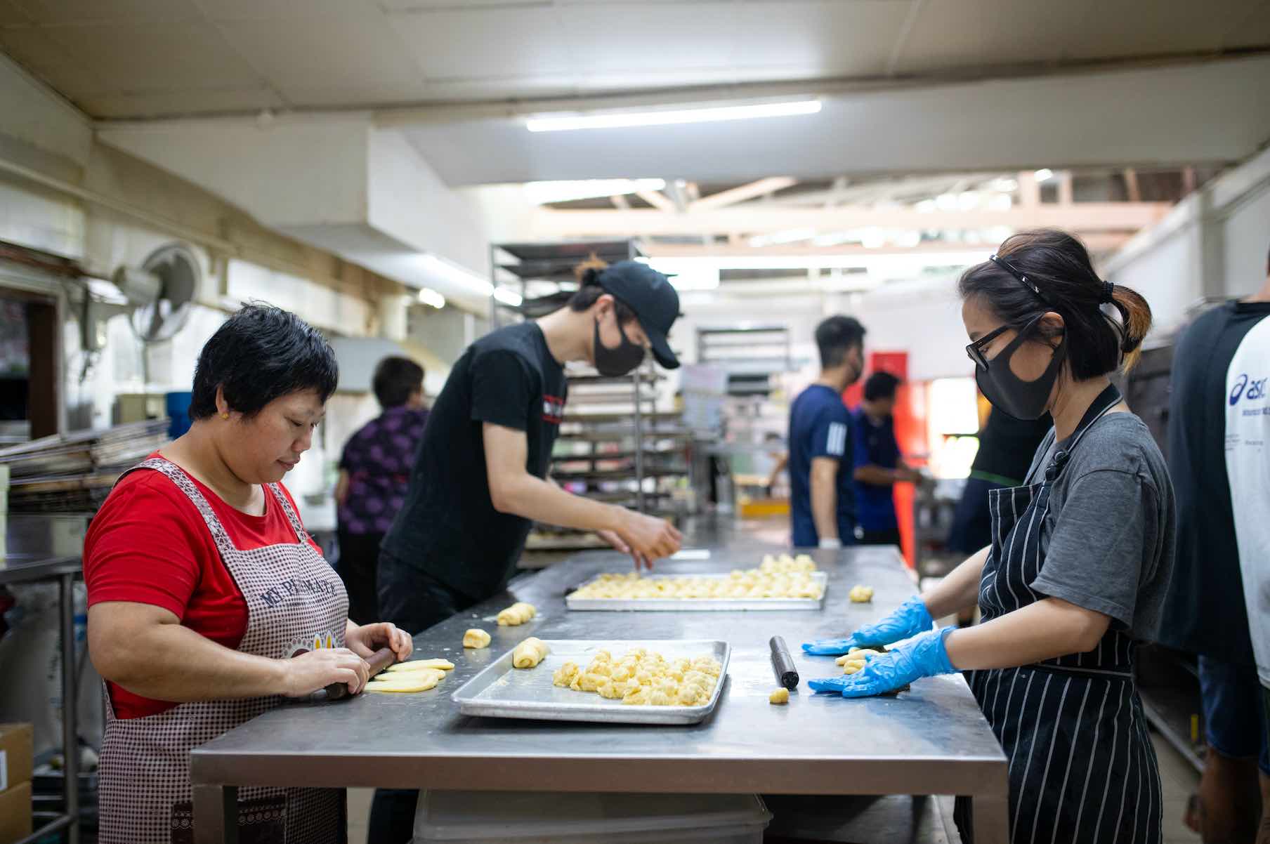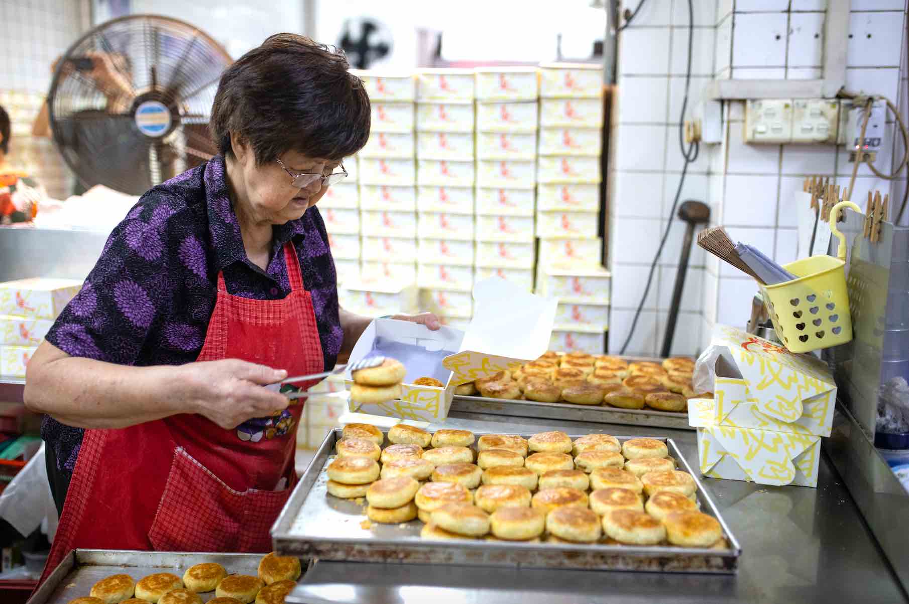 Today, Lee’s family continues to run Loong Fatt, where a team of bakers prepare 3,000- 4,000 tau sar piah every day. The exact recipe is a secret, but according to Mdm Loo Suan Mui, who has worked at Loong Fatt since the 1970s, high-quality flour and butter are used to produce a crispier crust, which differs from the softer crust of tau sar piah made in the traditional Teochew style. Loong Fatt’s bakers also carefully control the temperature of their gas-fired ovens to obtain a rich, buttery flavour.