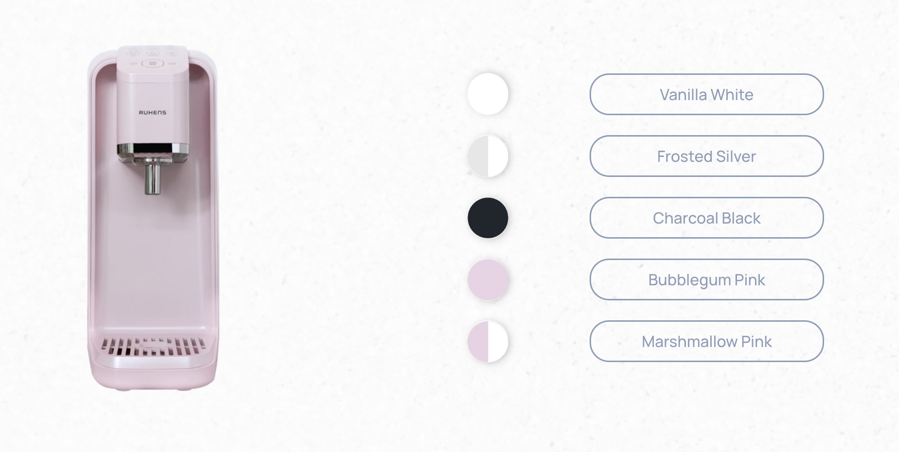 Ruhens V Series dispenses water at 4°C, 27°C, 40°C, 60°C, 87°C. With its UV sterilisation, you don’t need to sterilise it yourself because it cleans itself on its own.