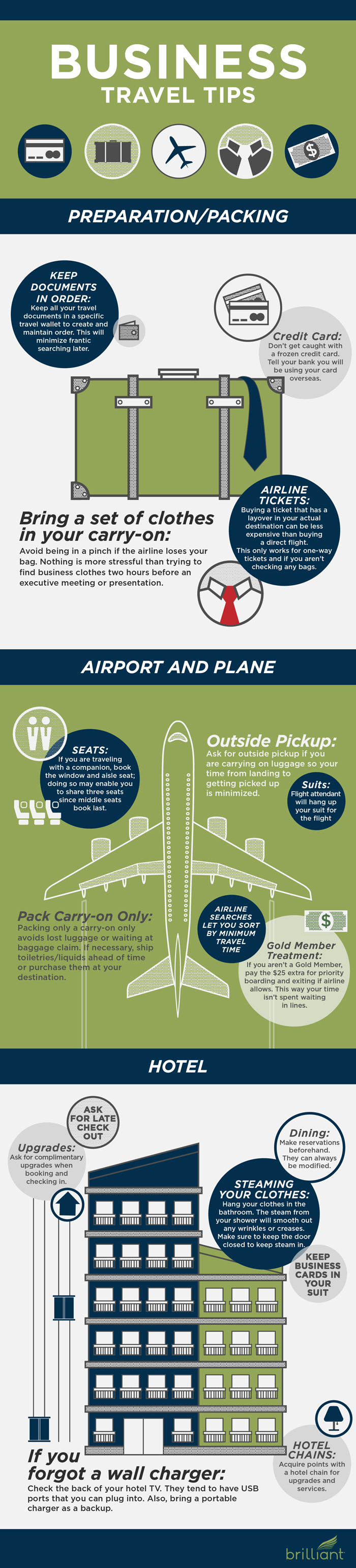 Frequent business traveler have lots of tricks up their sleeves when it comes to making their work trip as smooth as possible. As you know, minor screw ups along the way can compound into long periods of unproductive time. Here are some of the best work travel tips obtained by Brilliant from frequent business travellers to help greenhorn business travellers ensure that their trip is smooth, efficient and without drama.