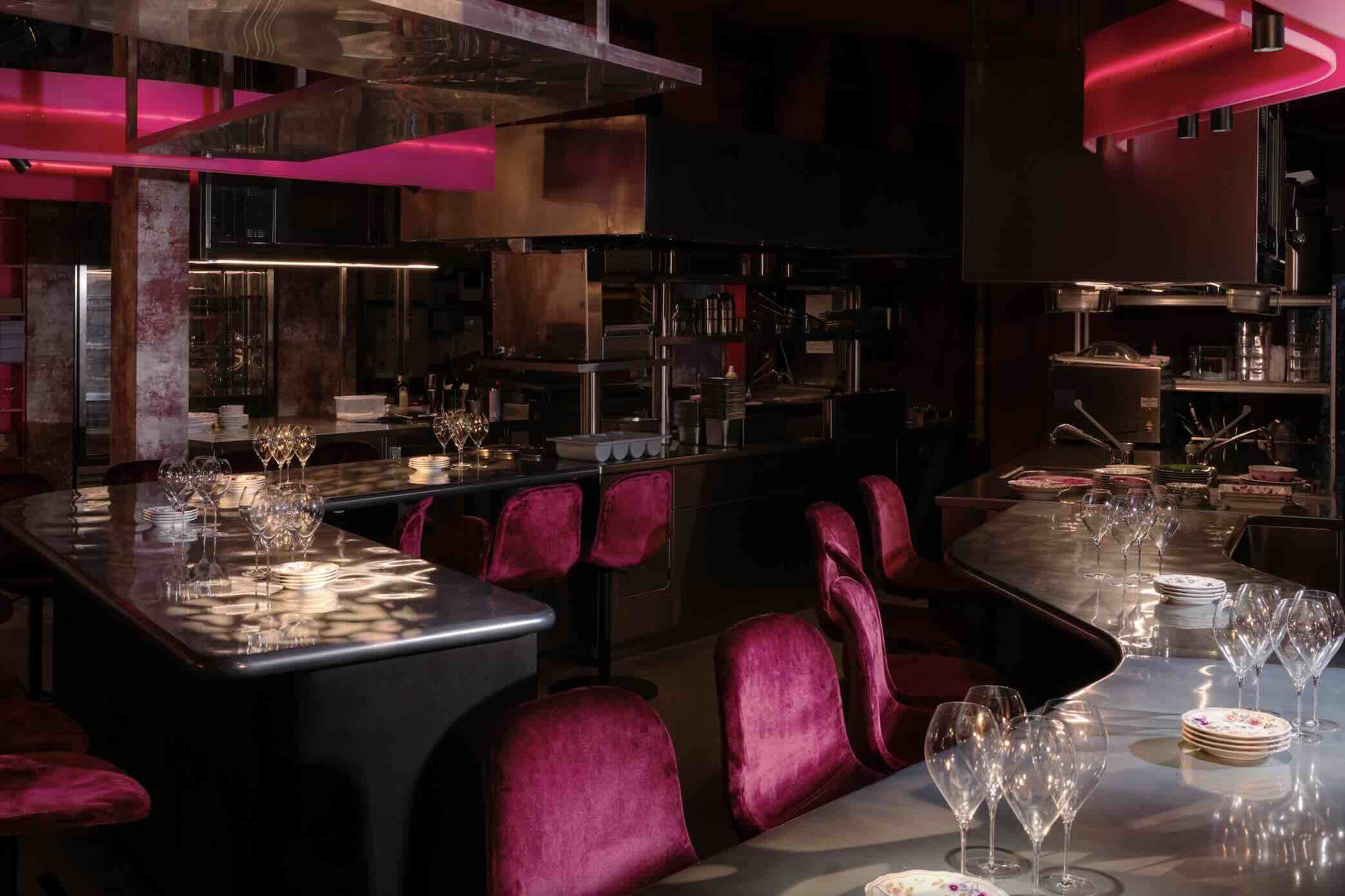 The space features upholstery from Dedar Milano, renowned for their exceptional craftsmanship and associations with luxury brands like Hermès. Italian artisans adorn the walls with decorations that give them a rustic yet sophisticated appearance alongside vibrant purple carpeting and vintage accents to add a touch of tactile and visual richness. Lighting, featuring theatrical projectors and a striking linear pink light, further enhances the ambiance, ensuring a truly immersive dining experience.