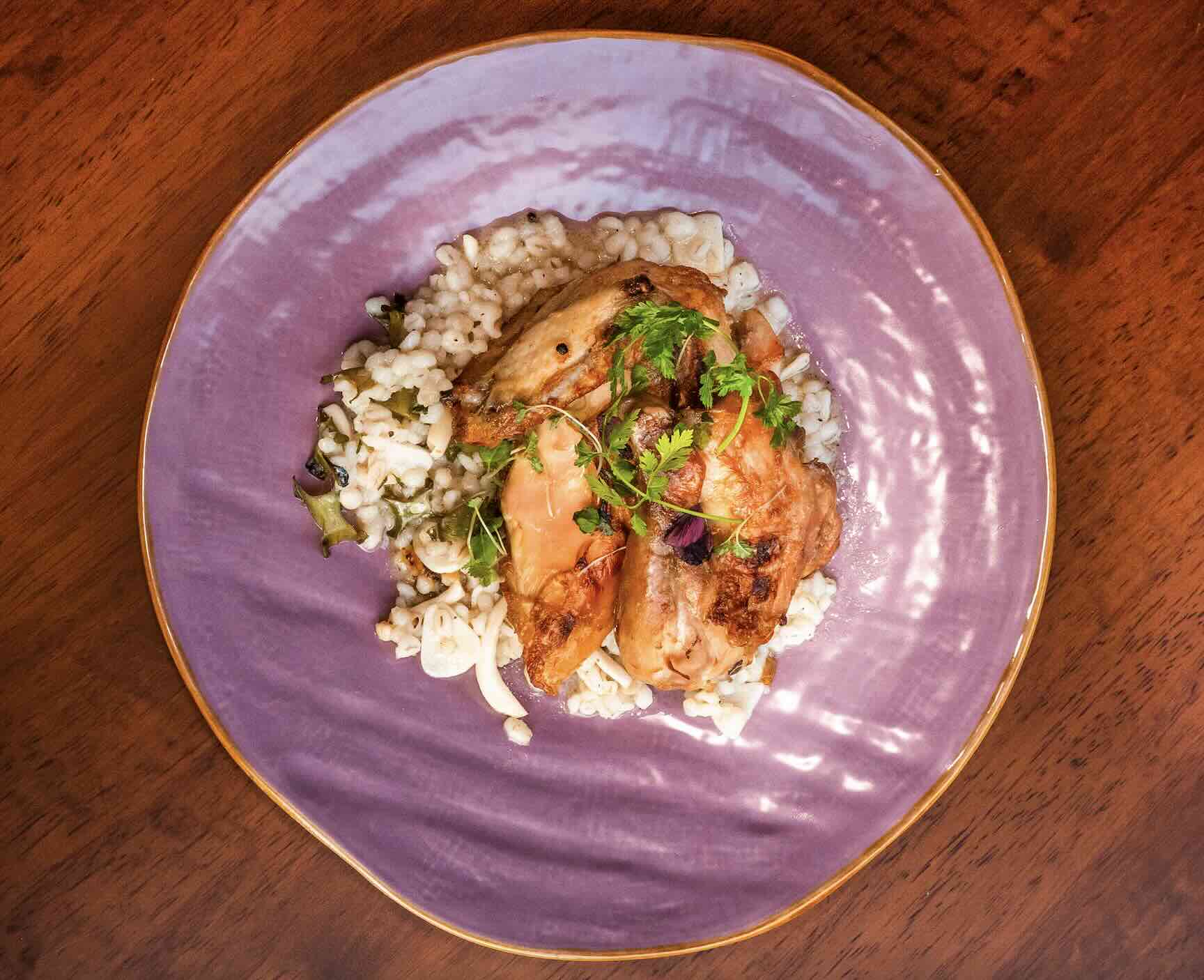 Indulge in their chart-topping Half Soy-Ginger Spring Chicken served on a bed of barley risotto. Succulent chicken, marinated in a luscious Chinese-inspired soy-ginger blend, ensures every bite bursts with tender juiciness. Paired perfectly with the canvas of creamy barley risotto infused with garlic, shallots, butter, parmesan cheese, and fresh thyme, this dish is a symphony of delicate flavours that will delight your taste buds and leave you craving more.