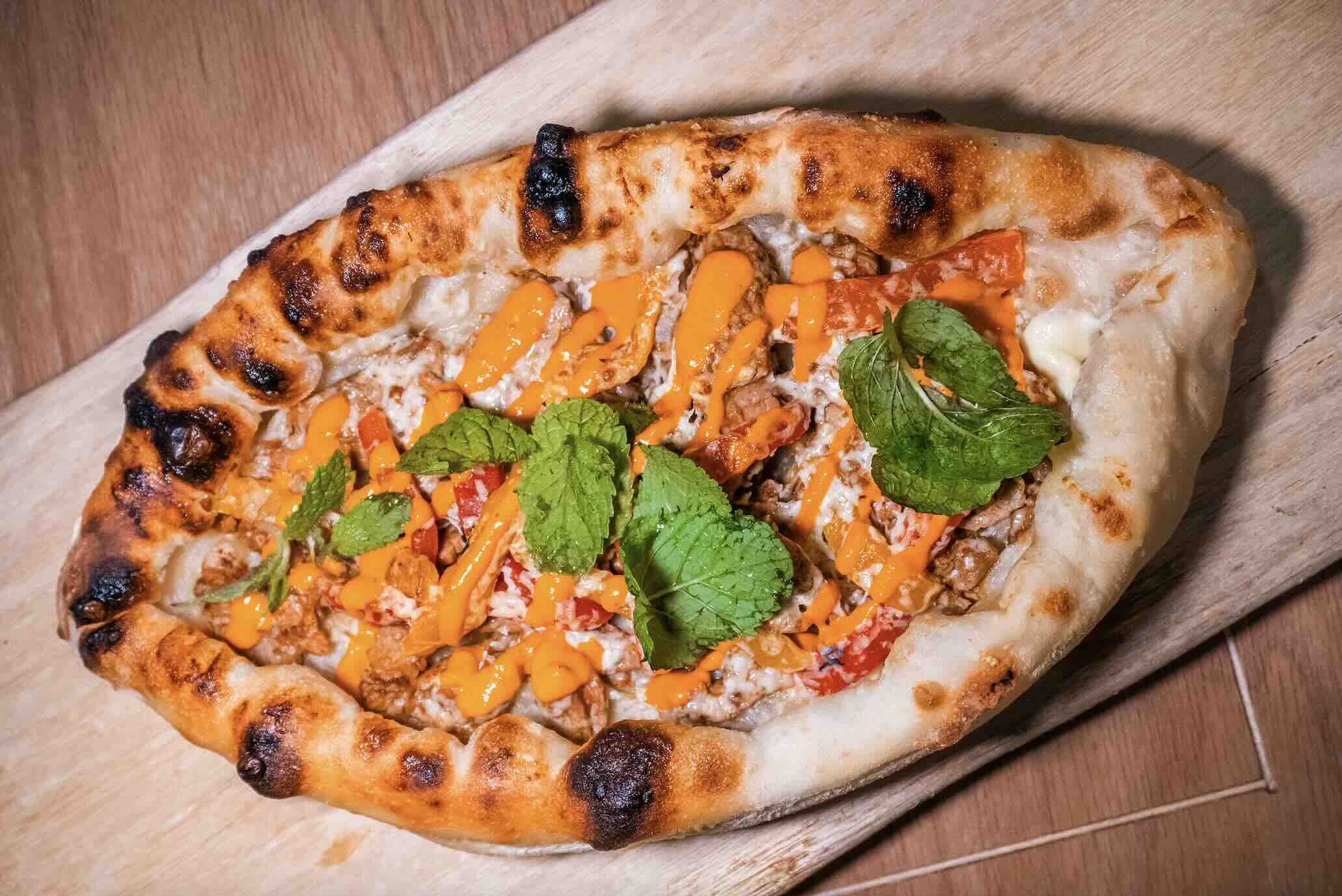 Uniquely handcrafted in a boat shape inspired by Turkish tradition, the Lamb Shawarma Pizza offers a departure from traditional open-faced Italian pizzas. This innovative design ensures that the ingredients remain moist and tender, delivering an unparalleled culinary experience. The lamb shawarma, crafted from premium cut lamb shoulder, undergoes a 12-hour marination in a blend of Middle Eastern spices before embarking on a 24-hour sous vide cooking process in a warm water bath, resulting in tender, flavourful meat. Topped with creamy feta cheese, spicy red pepper sauce infused with Middle Eastern-style yogurt, fresh mint, and roasted peppers, each slice bursts with vibrant flavours. All nestled on a freshly made sourdough crust, fermented for 24 hours to achieve the perfect balance of texture and taste.