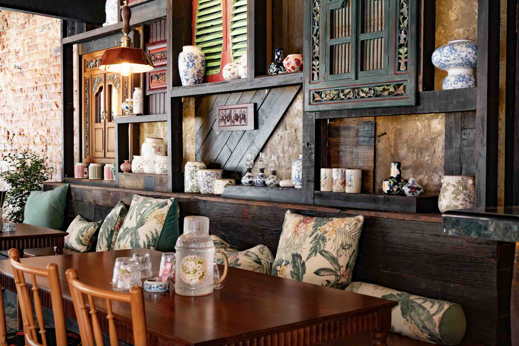 Alongside second-hand furniture, decorative pieces and recycled woods, the team also offers paper straws for an eco-friendly touch. Vibrant red accents further enhance the space, while Peranakan-inspired fabric ceiling drapes and lamps add an extra touch of charm. These elements are complemented by intricate mosaic tiles that pay homage to the rich heritage of Joo Chiat.