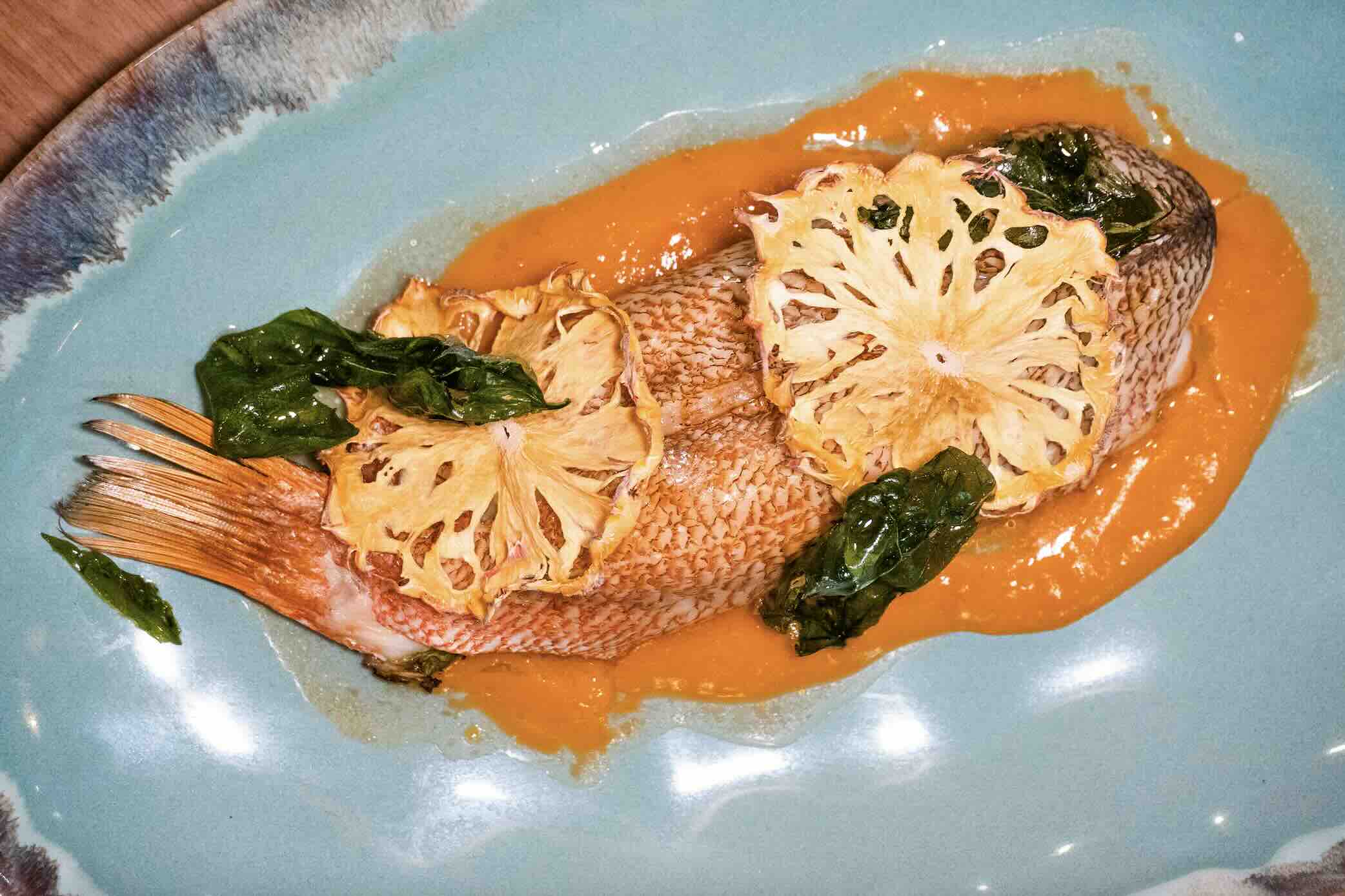 Savour tender, smoky charcoal-grilled fish, topped with their house-made basil-lime leaves oil and a luscious pina colada sauce. Complemented perfectly by stir-fried Chinese pea shoots (dou miao) with garlic, this dish offers a harmonious blend of flavours and textures. To add a touch of sophistication, the culinary team finishes it with a sprinkle of flake sea salt for that extra crunch. Enhancing the presentation, the in-house dehydrated pineapple slices serve as a refreshing garnish. Embark on a tropical culinary journey like no other.