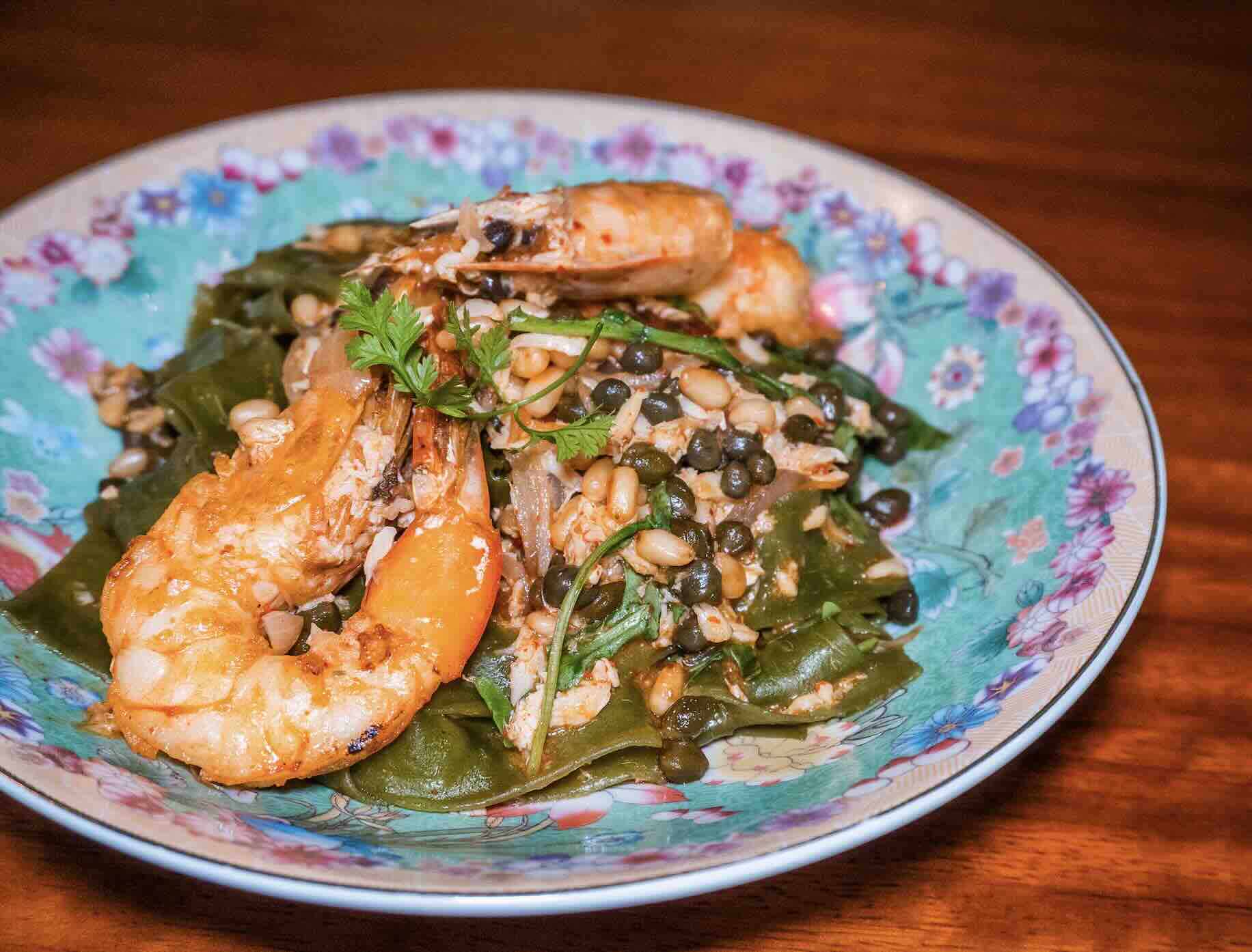Spinach Tagliatelle with Red Sea prawns and prawns and crab (Italian twist)