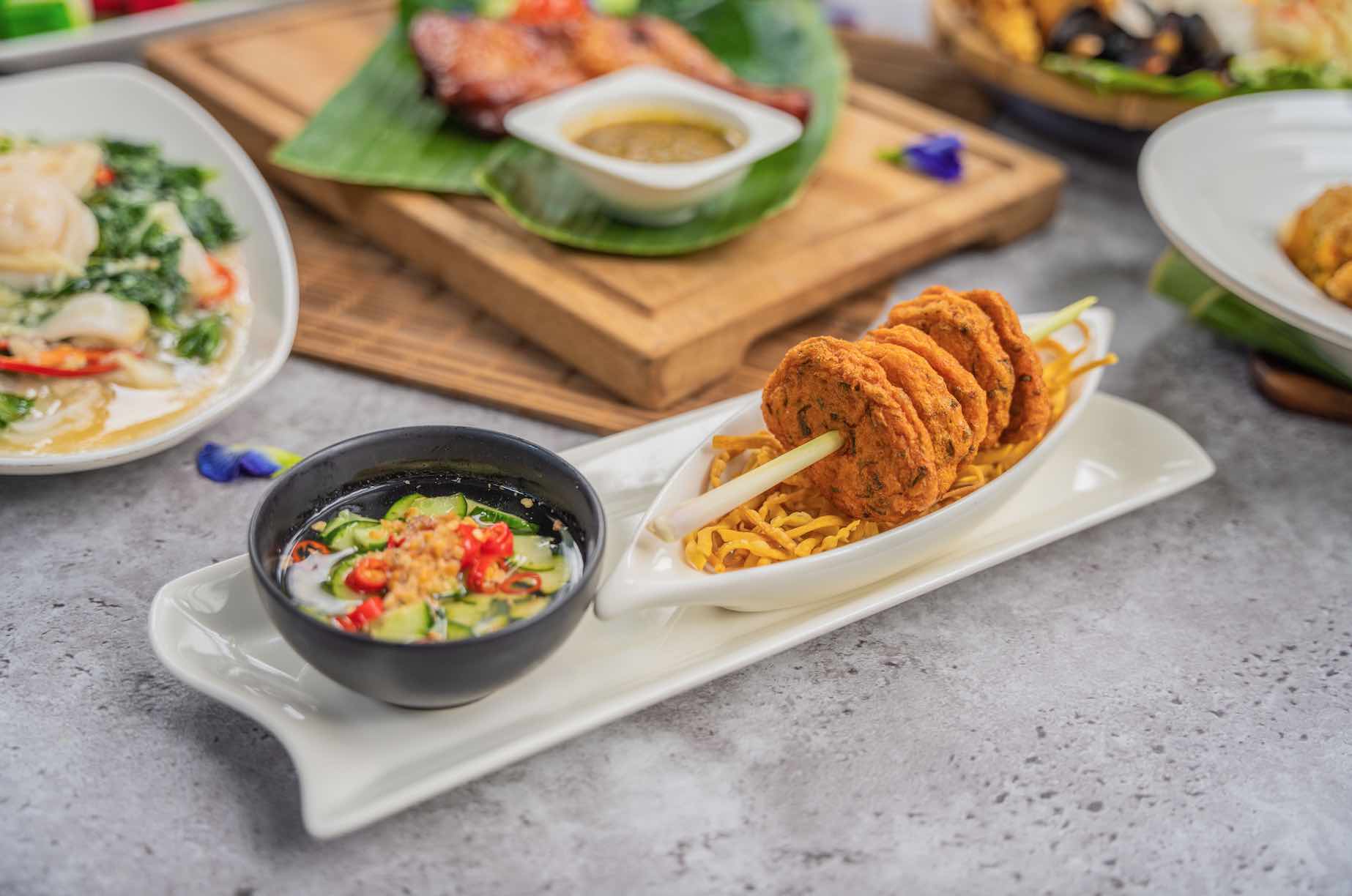 Savour Blue Jasmine’s take on the classic street food snack – the Deep-Fried Thai Fish Cake with Cucumber Relish. Featuring minced fish and prawn blended with red curry paste, finely sliced long beans and kaffir lime leaves, the fishcakes are complemented exceptionally well by Thai achar – a tangy union of cucumber, onion, chilli and peanuts pickled in a house-made vinegar blend.