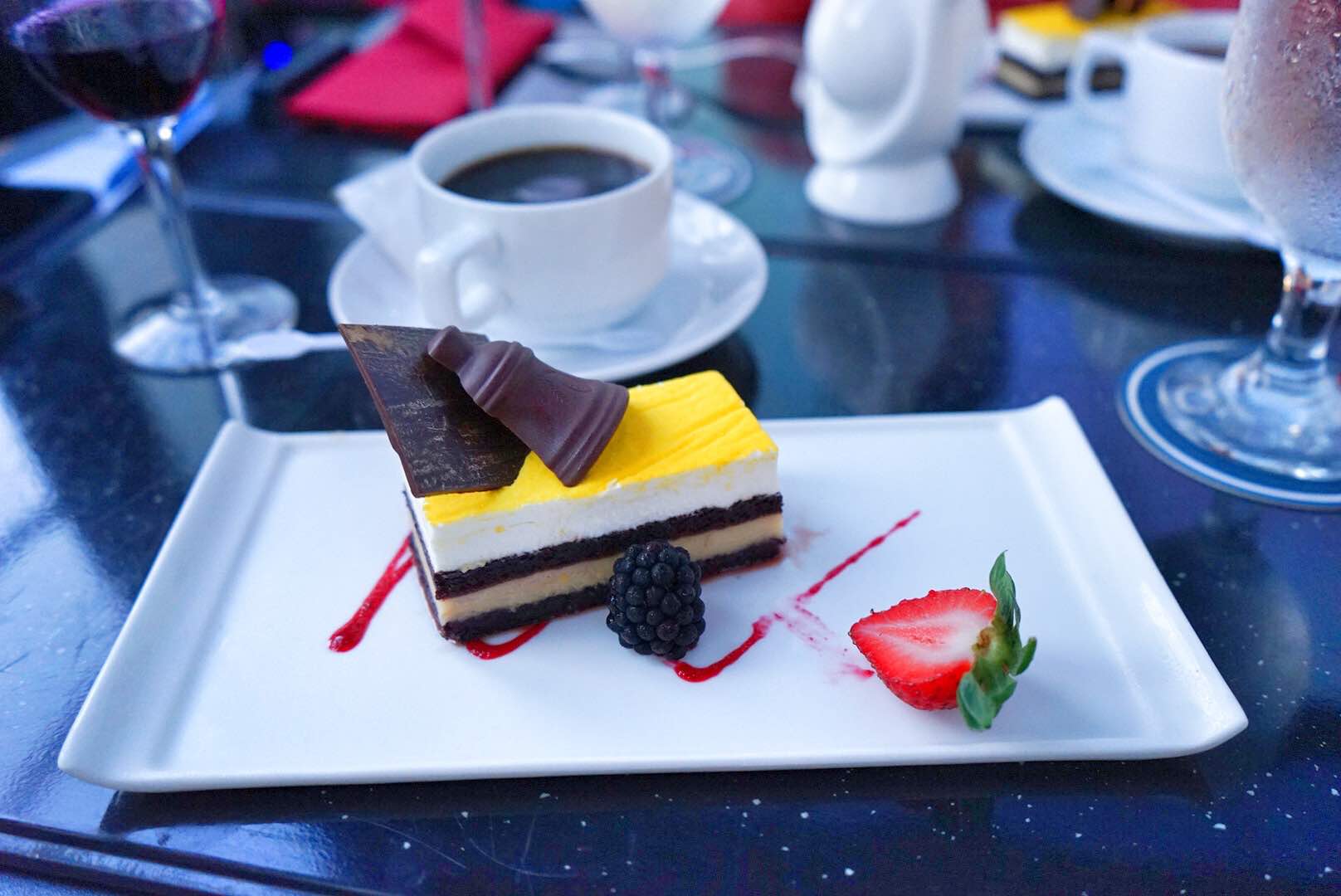 The other main was Pan-Roasted Norwegian Salmon Fillet with Mediterranean vegetable stew and potato gateau, apple cider cream sauce. Both mains were surprisingly professional and satisfying for a 4-course dinner served in a cable car cabin. Do pardon slight messy presentation for both our mains as we took the photo after a few bites (they looks so tasty that we forgot to take the photos first before eating. No fault of the servers). Each of the mains was paired with either a glass of red or white.