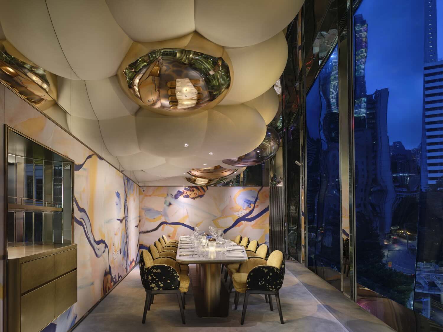 Step into a world designed to enchant. Created by AB Concept, the space mirrors a “culinary symphony.” At the entrance, a swirling water-vortex sculpture sets the tone. Inside, gold-leaf ceilings, pink marble counters, velvet textures, and art by Chef Back’s mother create a space that is personal, playful, and powerful. The signature sushi bar offers a front-row seat to the artistry, while private dining rooms promise intimate, immersive experiences with graffiti ceilings and bold design accents.