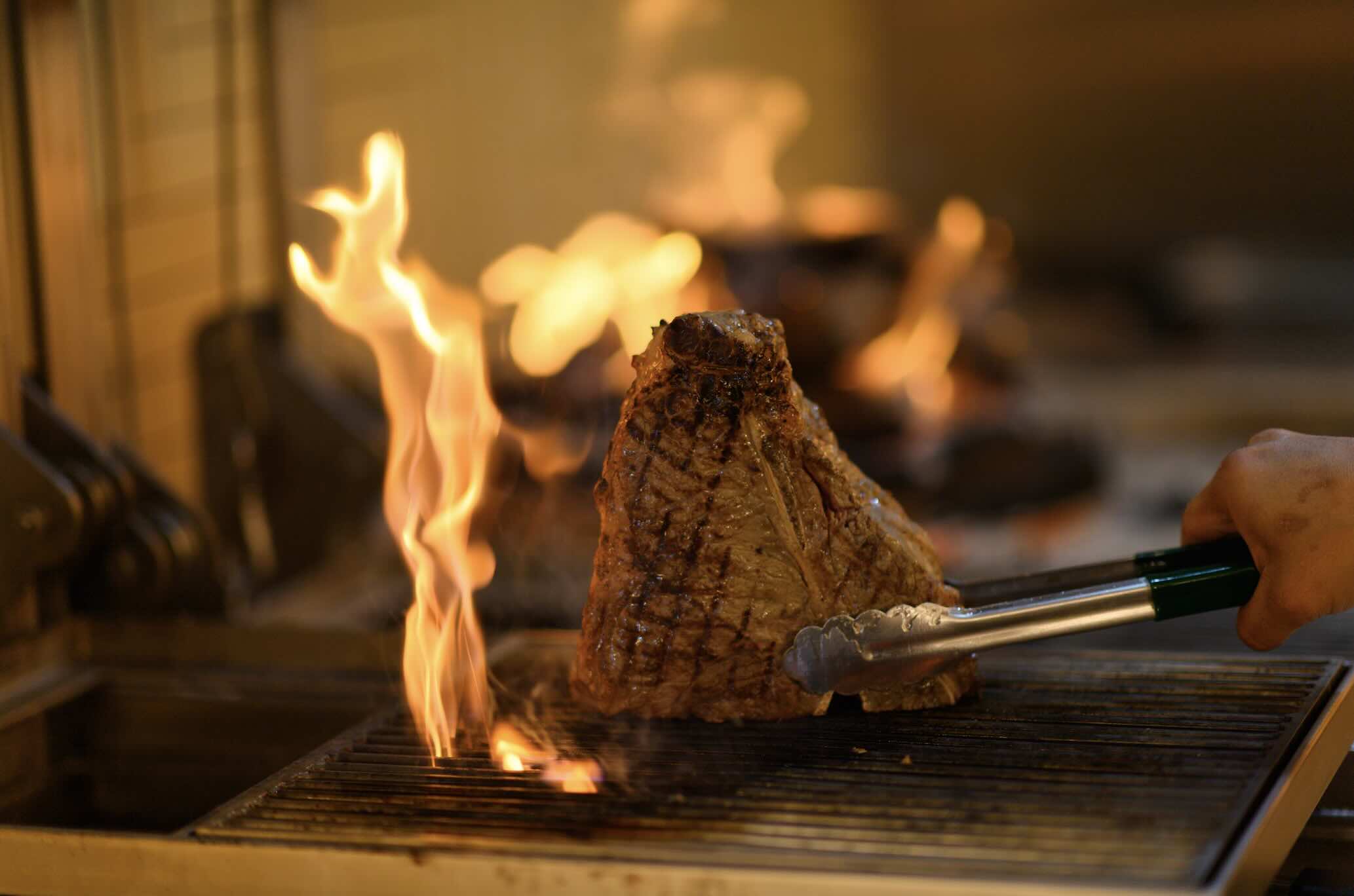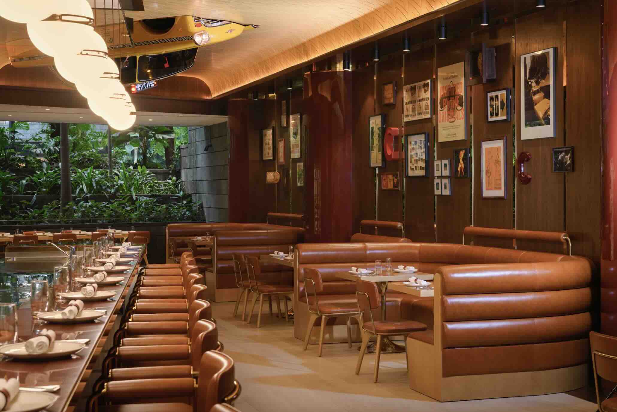 Overlooking Jewel’s Rain Vortex, the 56-seat dining room feels every bit like a stylised stage set — anchored by a curved ceiling, warm leather nooks, and a full-sized NYC taxi cab suspended overhead. A 10-seat bar and 10-seat chef’s counter bring guests up close to the action, where open flames and glowing coals set the mood.
