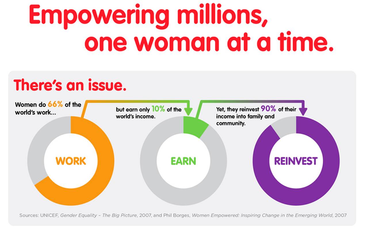 Furthermore, studies shown that women are much more likely to reinvest their income on food, education and healthcare for their children and their families. And women control $20 Trillion in spending worldwide, representing an economic impact larger than the U.S., China and India combined.