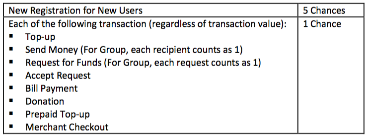Each transaction will be rewarded with 1 chance while new users will receive 5 chances. So the more transactions you make, the higher your chances of winning.