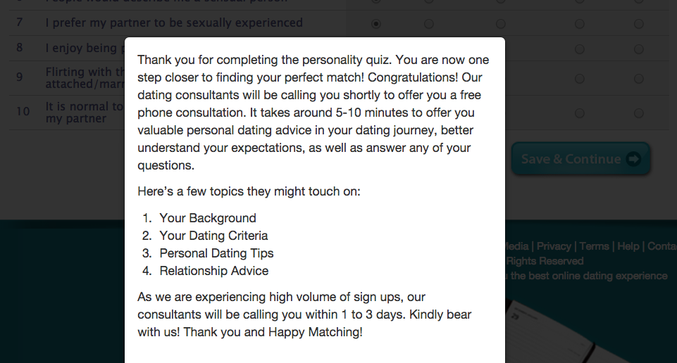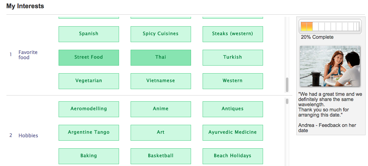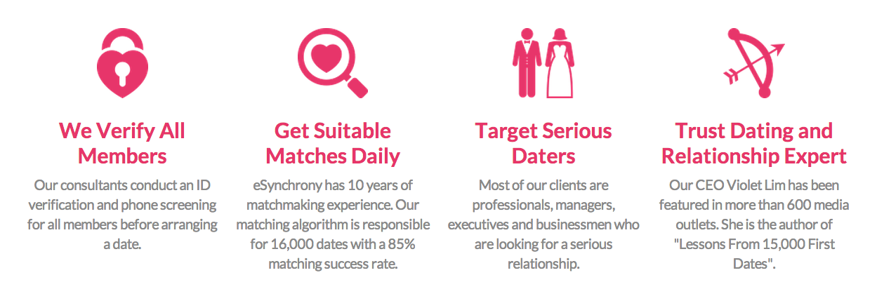 eSynchrony matching algorithm is built based on their 10 years experience with matchmaking offline through the Lunch Actually platform. Unlike some online dating sites whose algorithm is purely based on scientific research, eSynchrony algorithm is backed by their observation of real-life dates and couples. Values and beliefs in particular is extremely important when it comes to compatibility. Folks with different interests and hobbies and still function as a loving couple. However, with totally different value systems, it would be more difficult to reconcile or to see eye-to-eye. For example, family values – if one person would like to have dinner with his or her parents everyday or once a week, and the other person is pretty happy not to meet his or her parents for 3 years, then it is quite difficult for the latter to understand the former, and vice versa.
