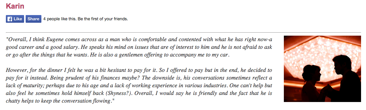 Being a SDNTrust Accredited Dating Agency and a Matchmaking Institute Certified Matchmaker, 3 out of 4 of their members are satisfied with their dates. That should not come as a surprise with the elaborated profiling and verification process in place.