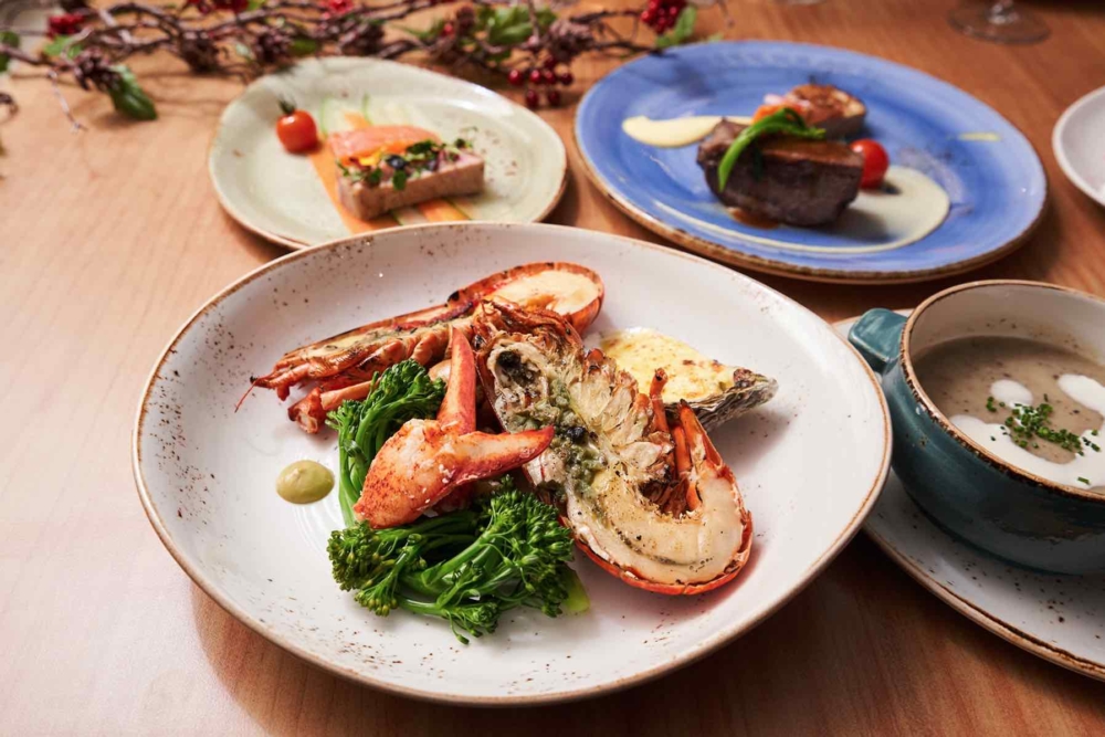 Enter the main course, a Live Maine Lobster Thermidor & South-Western Grilled Turkey Breast served with roasted potatoes and broccolini. Dessert brings a refreshing closure – Yuzu Panna Cotta with fresh berries.