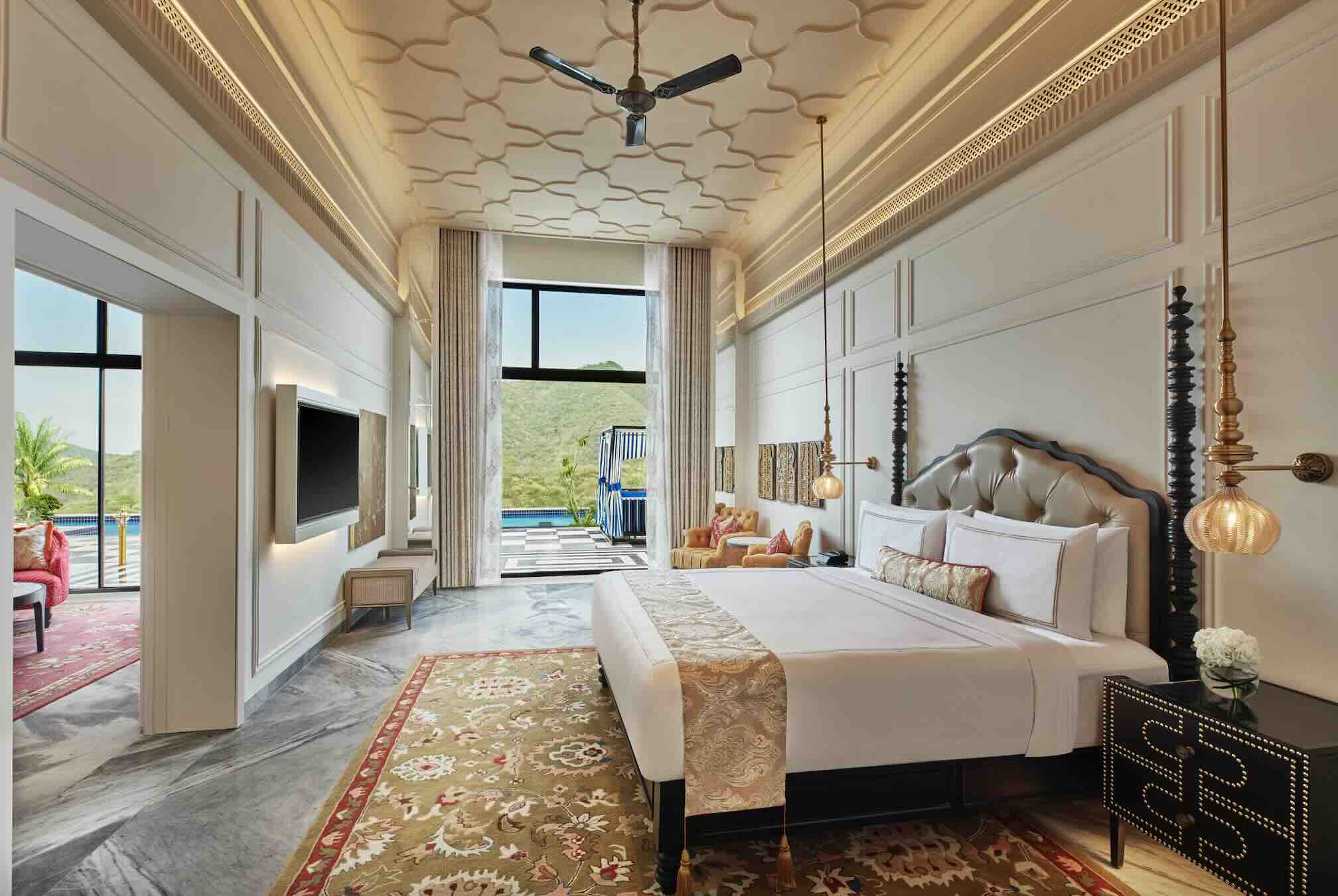 Inspired by Mewar’s grand fortresses and Rajasthan’s rich architectural legacy, Fairmont Udaipur Palace welcomes guests through the dramatic Raj Dwar—a gateway flanked by cannons and crowned by a soaring dome. Its three symbolic wings—Surya Mahal (Sun), Chandra Mahal (Moon), and Agni Mahal (Fire)—echo the primal elements, each rendered in detail through shaded walkways, glimmering stepwells, and torch-lit corridors.
