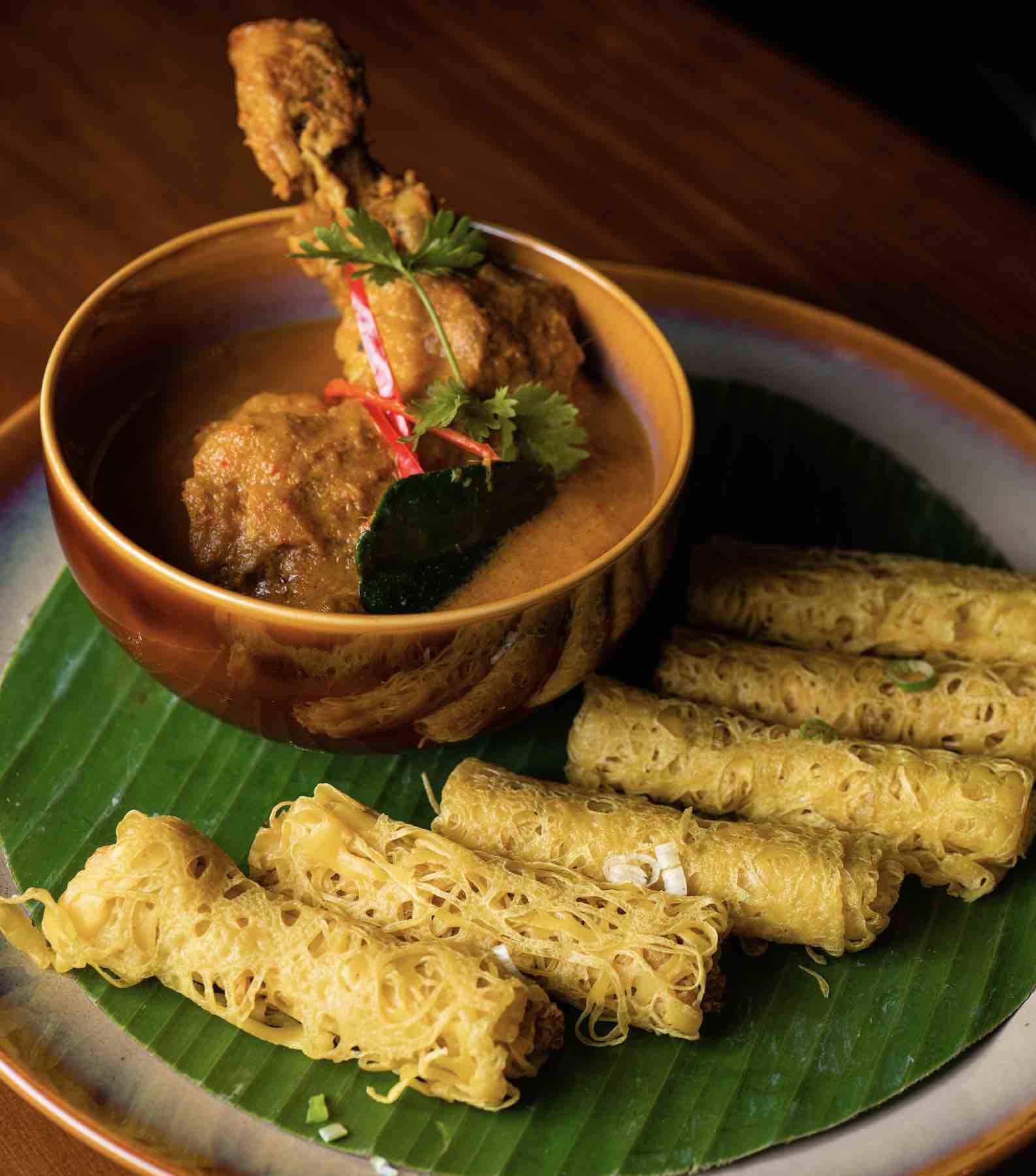 Diners preferring a more homely feast will enjoy the Kapitan with Nets, where the chicken bone is simmered in a fiery chicken kaffir lime curry over low heat till the meat is fork tender. Traditional lace crepes are served on the side to mop up the curry.