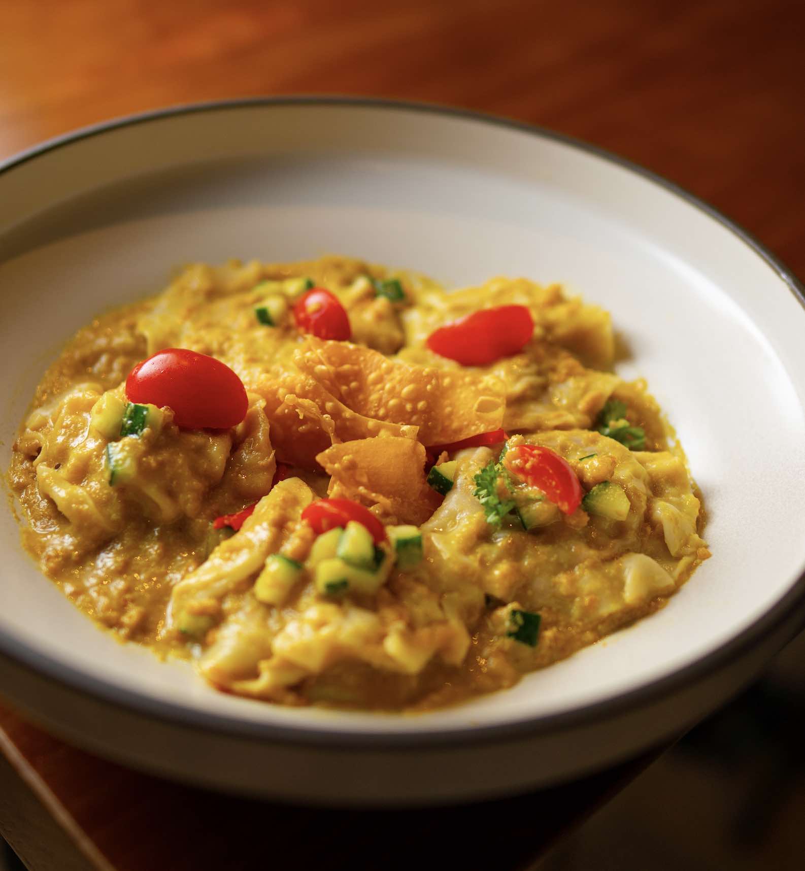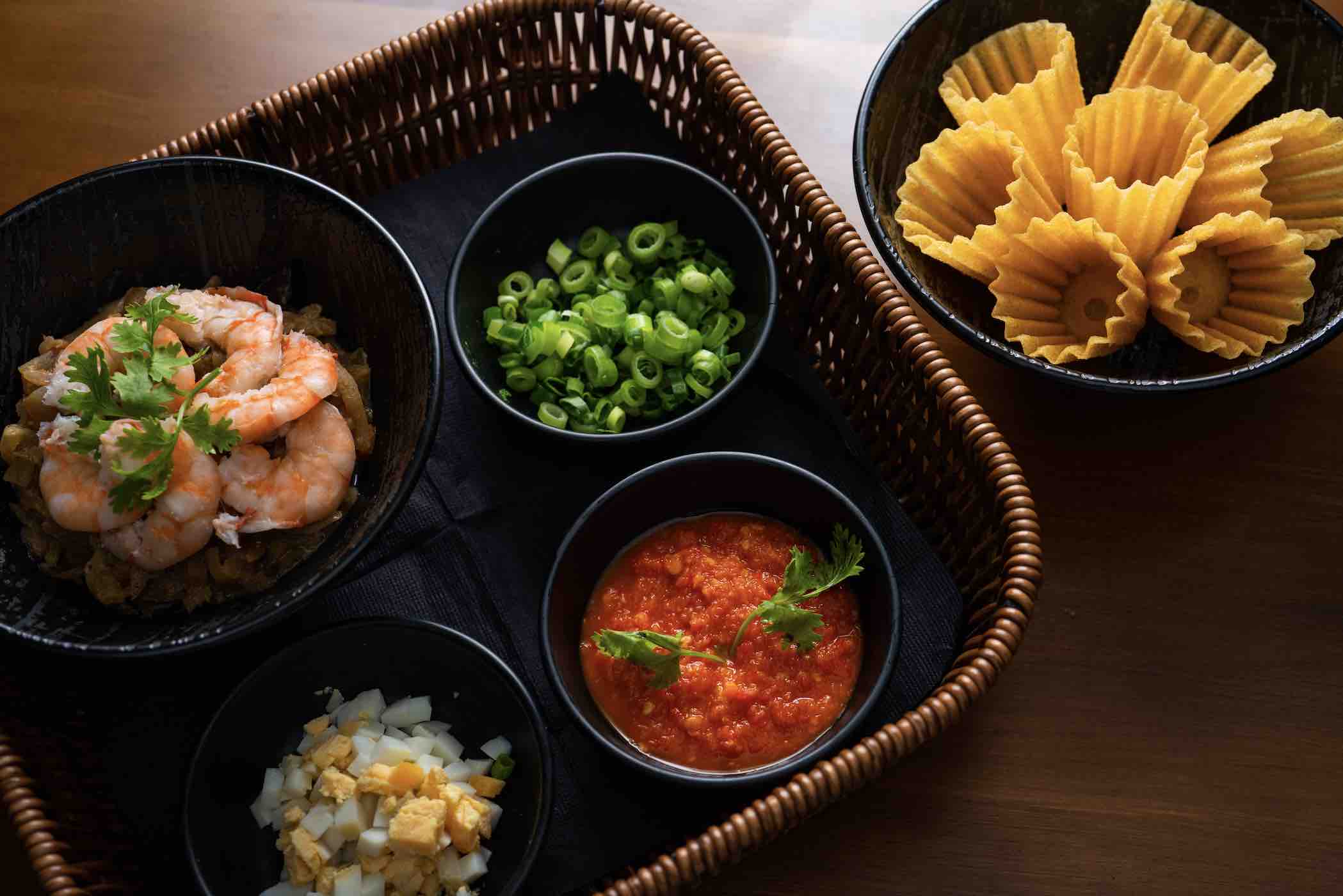 Presented DIY-style, the Nyonya Pie Tee features a fragrant filling of braised turnip, carrots and shiitake mushrooms, juicy prawns, and a picante garlic ginger chilli dip to enhance the flavours.
