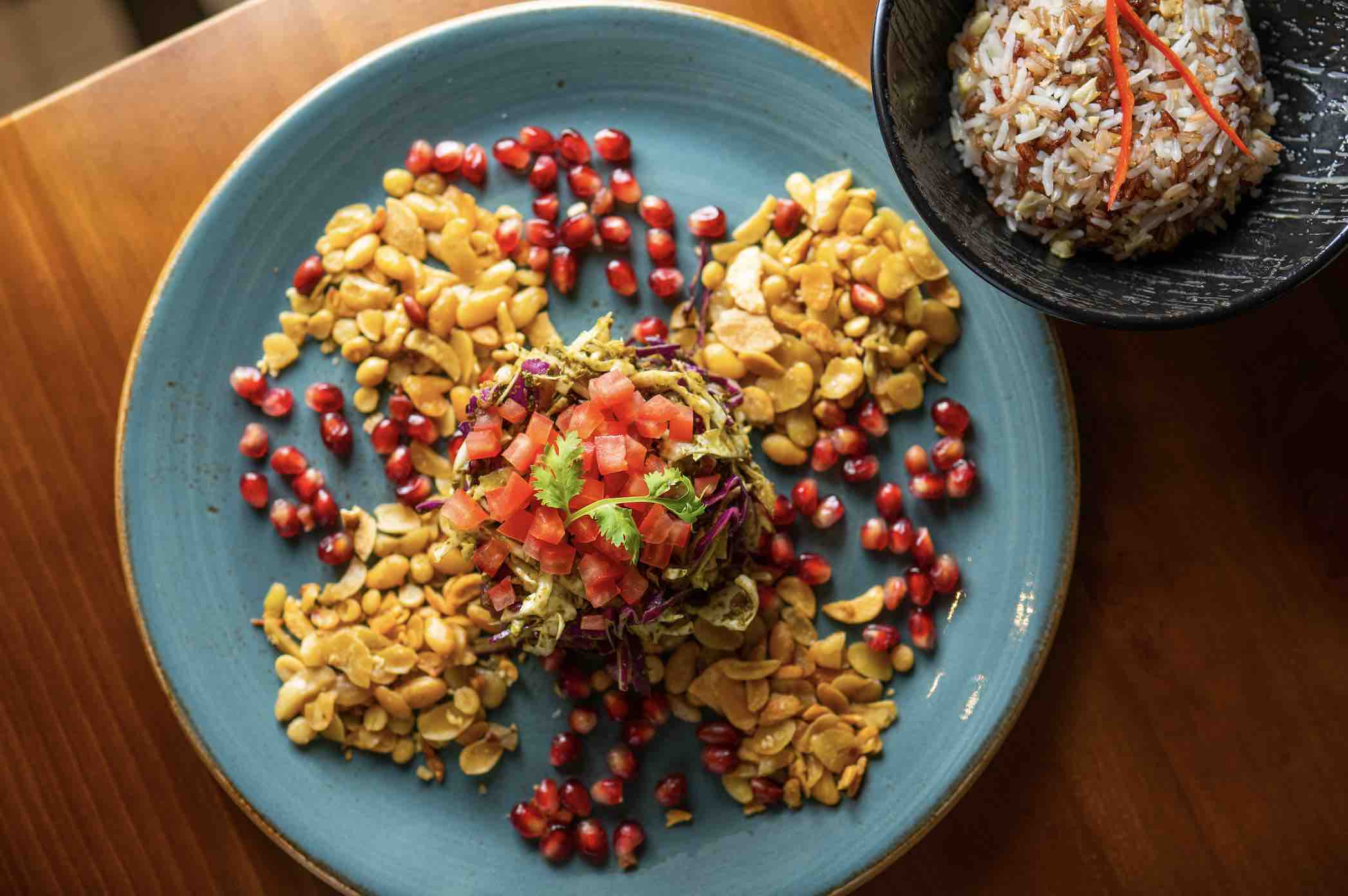 A re-imagination of famous Burmese salad laphet is the Salad & Tea. Served with a side of multi-grain and cauliflower rice, the colourful and crunchy salad is beautifully presented with a plate full of ingredients, ranging from purple cabbage to pomegranate, garlic chips, chopped tomatoes, broad bean lentils and an array of nuts, all dressed in a spice-heavy fermented tea sauce.