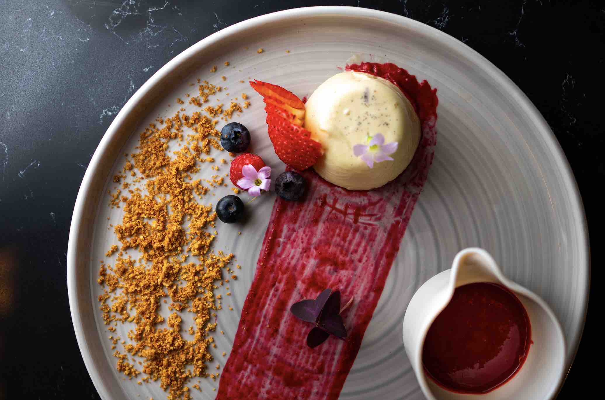 A highlight on the dessert menu is the Vanilla Bean Panna Cotta made with Madagascan vanilla beans. Here, velvety creamy panna cotta is elegantly plated with a side of raspberry coulis, berries, and ginger flower sand and is the perfect light dessert to round up the meal.