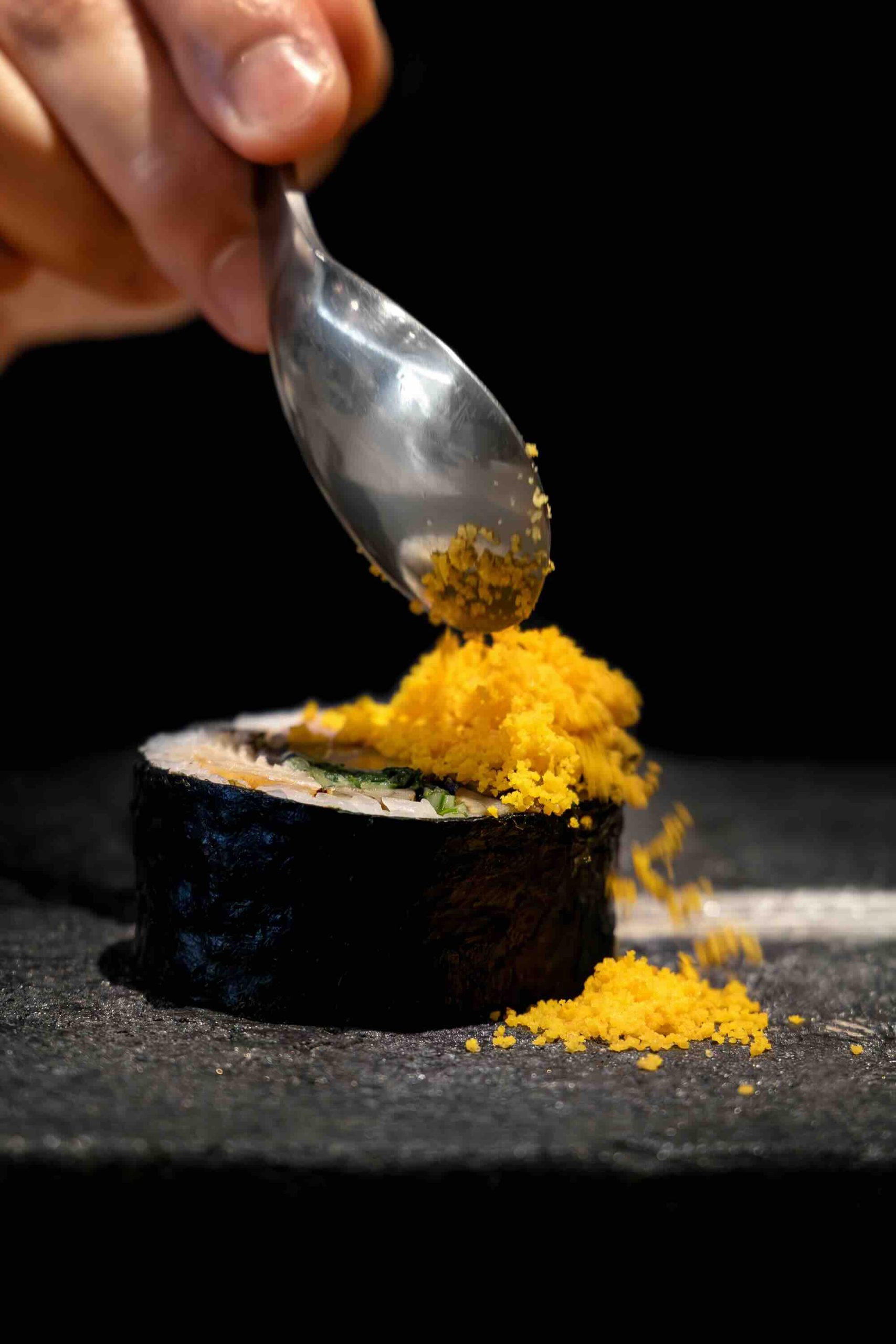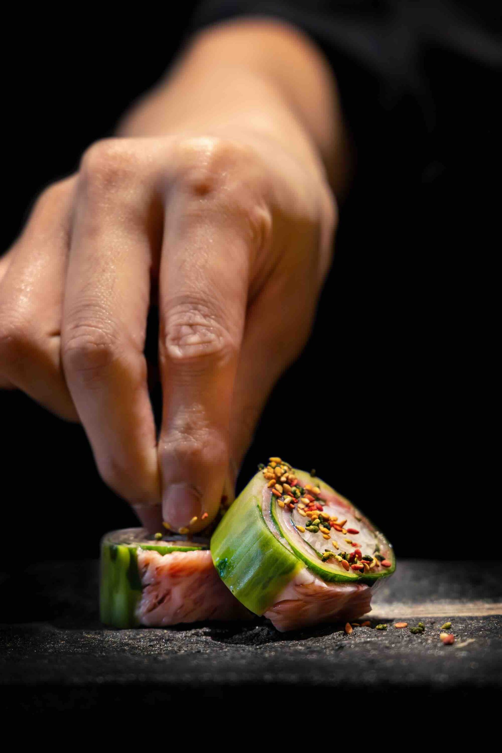 Next comes Wagyu & Yasai Maki, bringing together vinaigrette marinated cucumber, shiso leaf and finger lime with marinated egg yolk enriched with tamari. Five colour sesame seeds and Kaluga caviar accent the roll, while BBQ enoki mushrooms lend an earthy, smoky dimension.